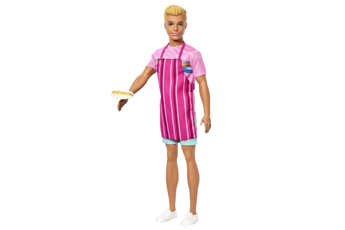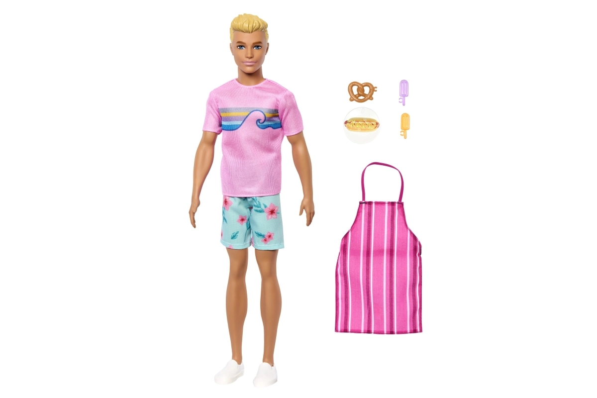 - Κούκλα Ken, ροζ μπλουζάκι, λουλουδάτο σορτς, λευκά παπούτσια, ριγέ ποδιά, pretzel, hot dog, 2× παγωτίνι