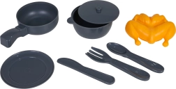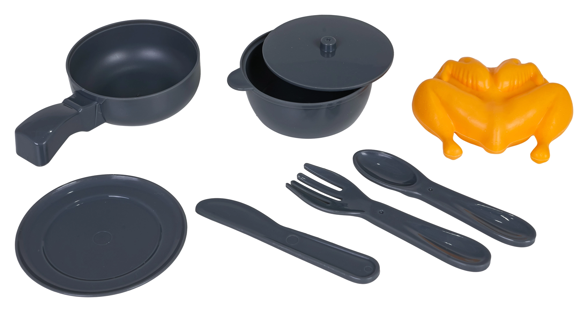 Περιλαμβάνονται τηγάνι, κατσαρολάκι με καπάκι, πιατάκι, μαχαιροπίρουνα και ομοίωμα κοτόπουλου – όλα για τον ολοκληρωμένο ρόλο του μικρού σεφ.