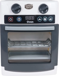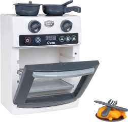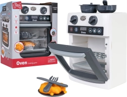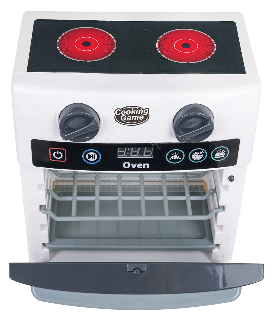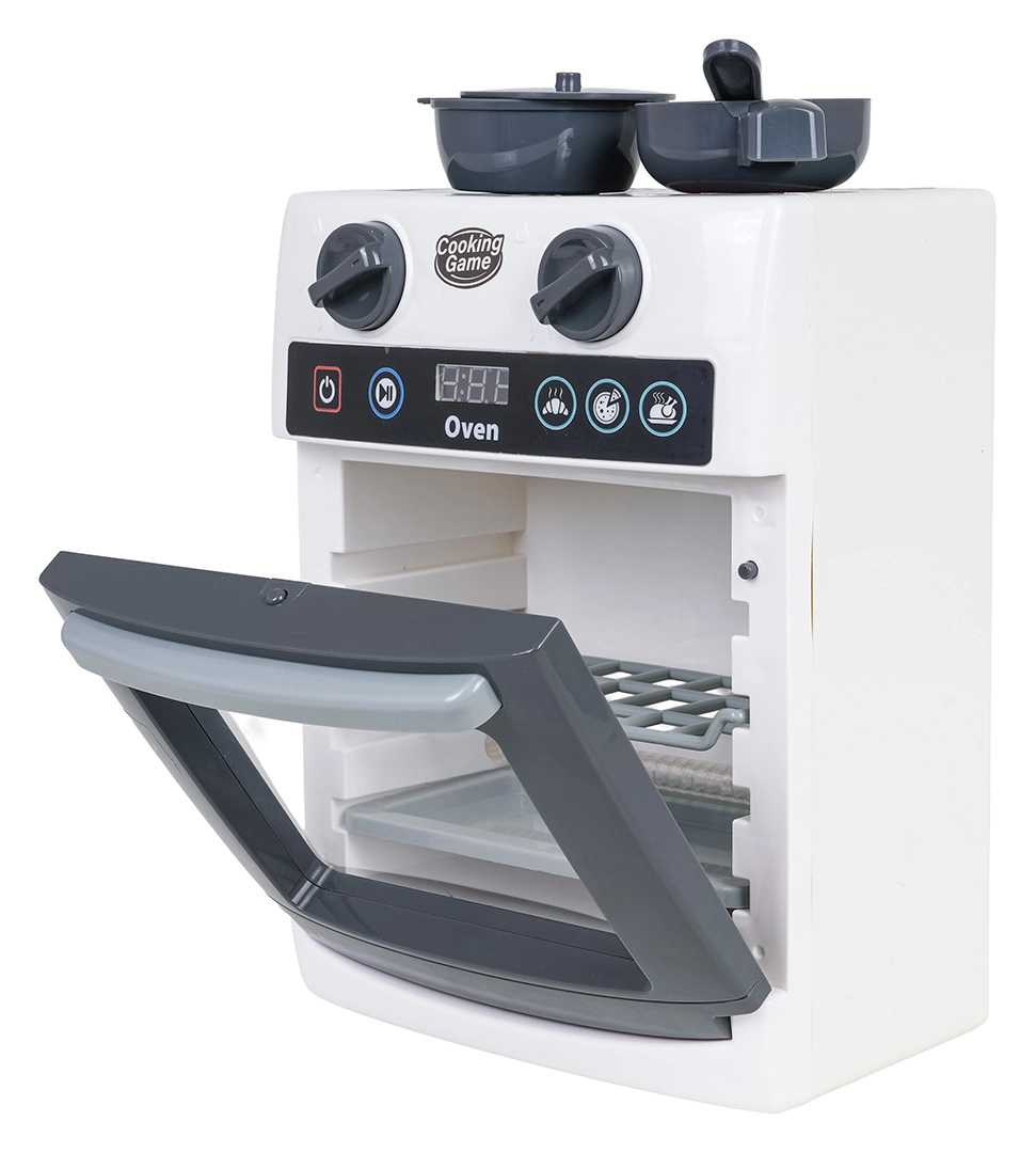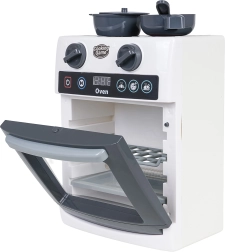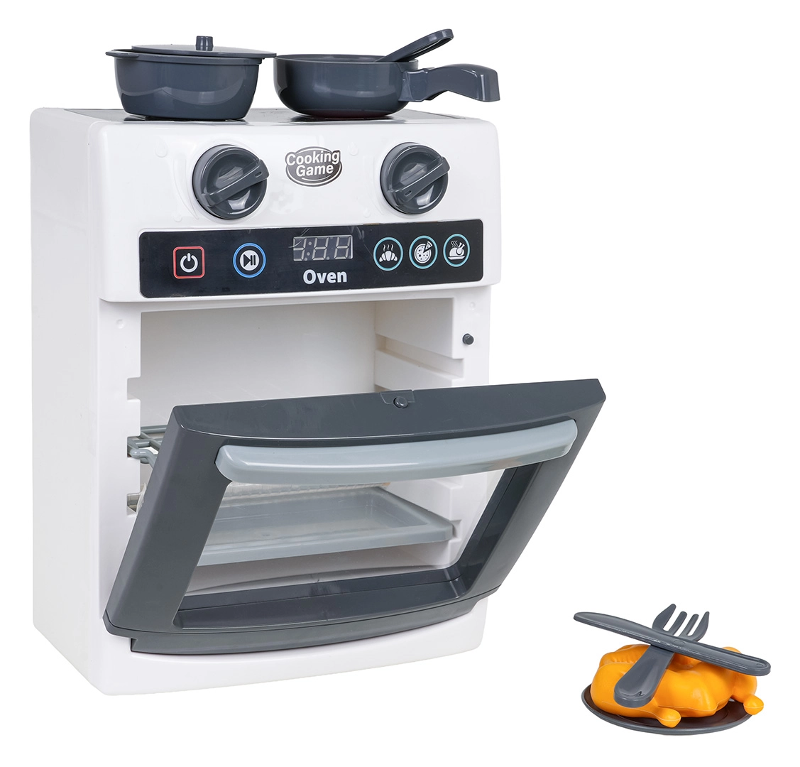 Αυτός ο παιδικός φούρνος μιμείται πιστά μια πραγματική συσκευή – διαθέτει διάφανη πόρτα, κινούμενους επιλογείς και πίνακα με χρονοδιακόπτη. Κατά το ψήσιμο φωτίζεται το εσωτερικό και ακούγονται ρεαλιστικοί ήχοι ανοίγματος/κλεισίματος πόρτας, ψησίματος και ολοκλήρωσης προγράμματος. Το παιχνίδι ρόλων σεφ αποκτά νέα διάσταση δημιουργικότητας και φαντασίας.