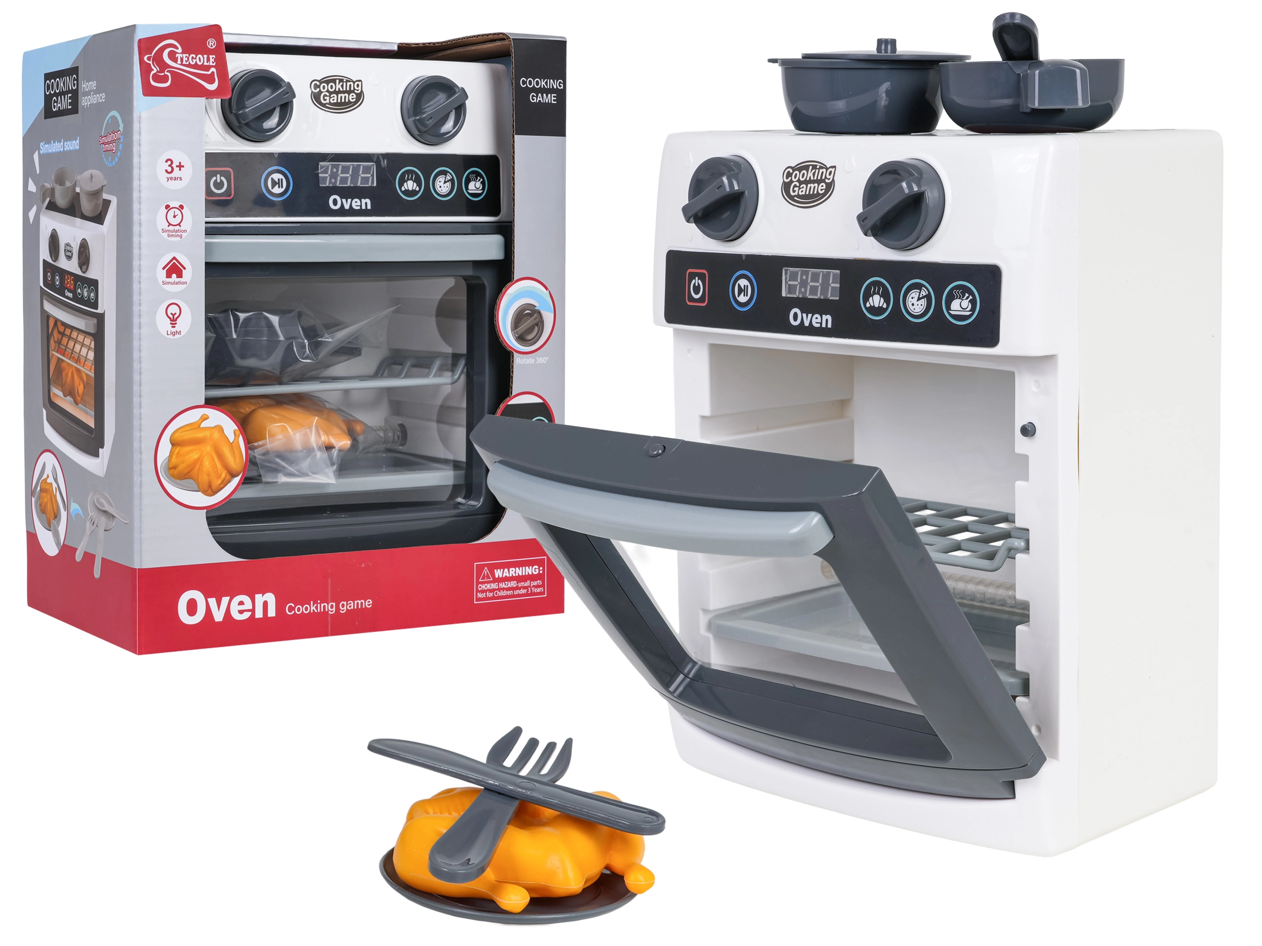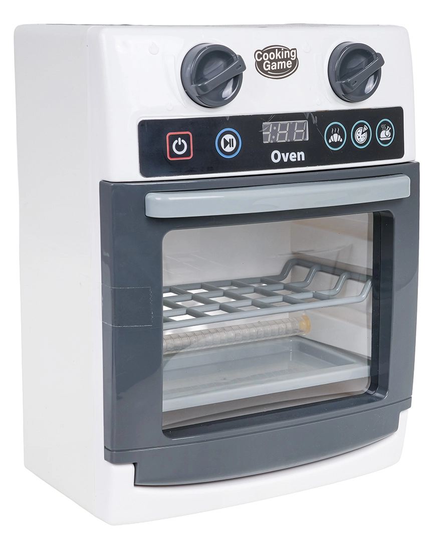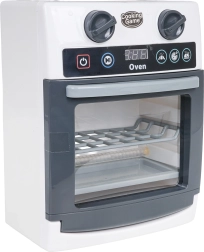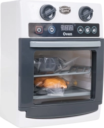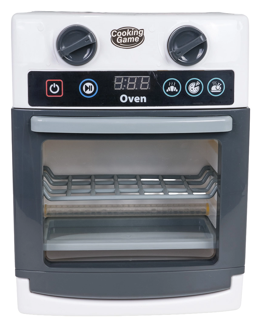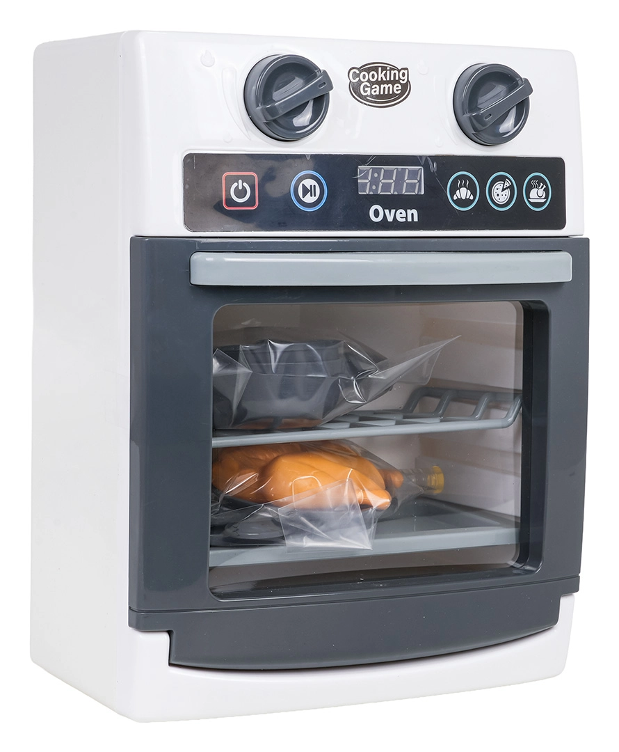Αυτός ο παιδικός φούρνος μιμείται πιστά μια πραγματική συσκευή – διαθέτει διάφανη πόρτα, κινούμενους επιλογείς και πίνακα με χρονοδιακόπτη. Κατά το ψήσιμο φωτίζεται το εσωτερικό και ακούγονται ρεαλιστικοί ήχοι ανοίγματος/κλεισίματος πόρτας, ψησίματος και ολοκλήρωσης προγράμματος. Το παιχνίδι ρόλων σεφ αποκτά νέα διάσταση δημιουργικότητας και φαντασίας.