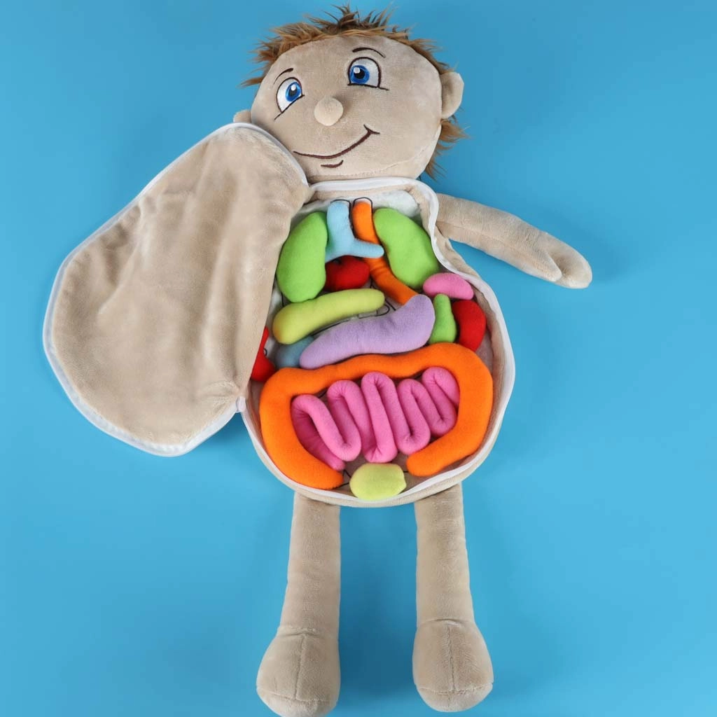 Ανακαλύψτε έναν διασκεδαστικό και ασφαλή τρόπο για να γνωρίσουν τα παιδιά το ανθρώπινο σώμα. Αυτή η εκπαιδευτική λούτρινη κούκλα έχει κοιλίτσα με φερμουάρ και στο εσωτερικό κρύβει μαλακά, πολύχρωμα όργανα στερεωμένα με βέλκρο, τα οποία μπορούν να αφαιρούνται και να τοποθετούνται ξανά. Είναι κατασκευασμένη από απαλό πολυέστερ, ενισχύει τη λεπτή κινητικότητα, τη περιέργεια και τη μάθηση μέσω του παιχνιδιού, ιδανική για παιδιά από 3 ετών για το σπίτι, νηπιαγωγεία και θεραπευτικούς χώρους.