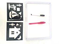 Χάρη στην ελαφριά και φορητή κατασκευή είναι ιδανικός για το σπίτι και τα ταξίδια. Περιλαμβάνονται στένσιλ με σχήματα (σπίτι, καράβι, πύραυλος, φιγούρες, σεληνιακά μοτίβα) που υποστηρίζουν την ανάπτυξη της δημιουργικότητας, της φαντασίας και της λεπτής κινητικότητας.