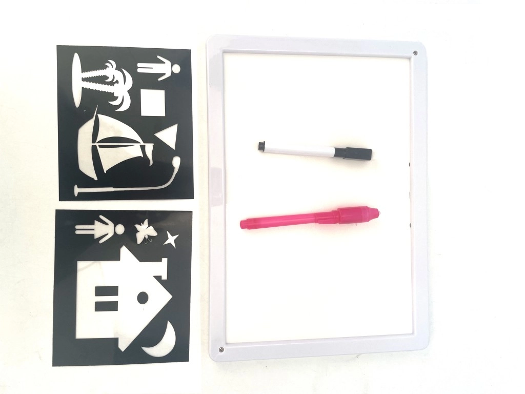 Ανακαλύψτε διασκέδαση χωρίς ακαταστασία με ένα δημιουργικό βοήθημα για παιδιά από 3 ετών. Αυτή η ελαφριά πινακίδα σχεδίασης μεγέθους A4 επιτρέπει ζωγραφική με ειδικό φωτεινό στυλό και δημιουργία μαγικών εικόνων που λάμπουν στο σκοτάδι. Χάρη στον διπλής όψης σχεδιασμό προσφέρει διπλή χρήση – φωτεινή ζωγραφική και κανονικό σχέδιο σε λευκή επιφάνεια. Στη συσκευασία θα βρείτε 2 στυλό, στένσιλ σχημάτων και μπαταρίες LR44 για άμεση χρήση.