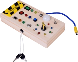 Ανακαλύψτε μια compact μοντεσσοριανή πλακέτα που αναπτύσσει τη λεπτή κινητικότητα, τη συγκέντρωση και τη λογική σκέψη. Τα παιδιά θα λατρέψουν τα φωτιζόμενα LED, τους διακόπτες και τα κουμπιά, το κλειδάκι και το περιστροφικό κομβίο. Ασφαλές φυσικό ξύλο, λείες άκρες και ήσυχο, ουσιαστικό παιχνίδι χωρίς οθόνη – ιδανικό στο σπίτι και στο ταξίδι.
