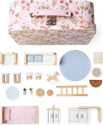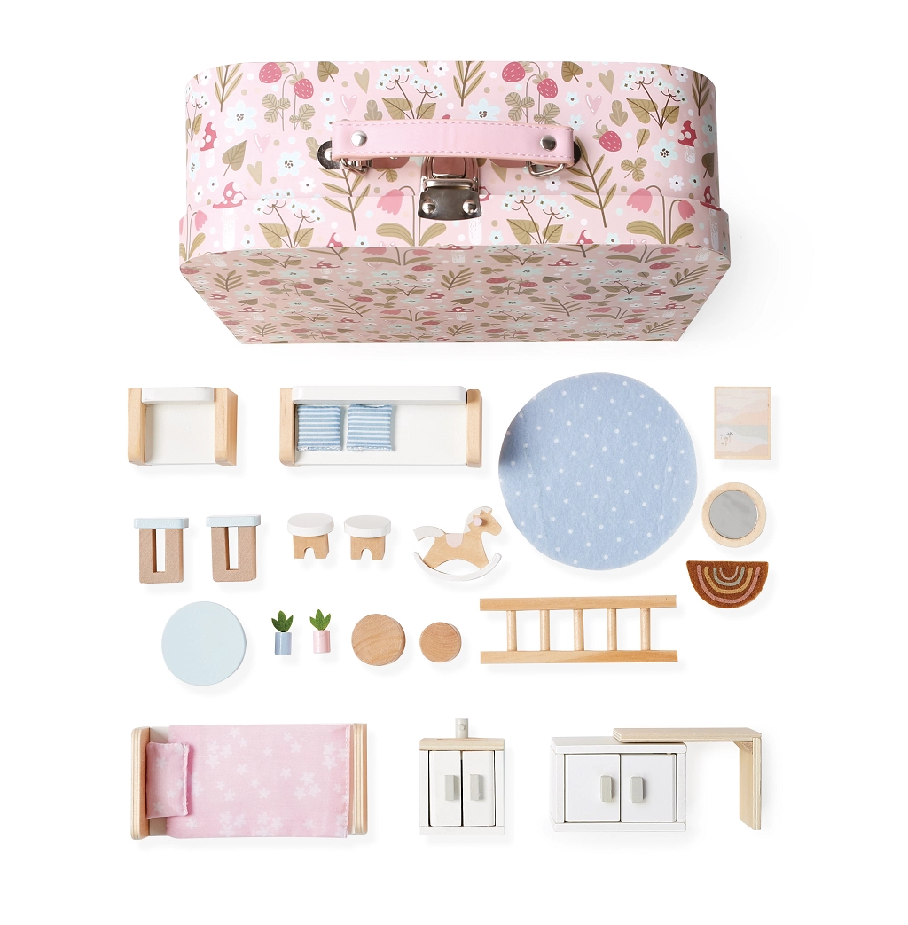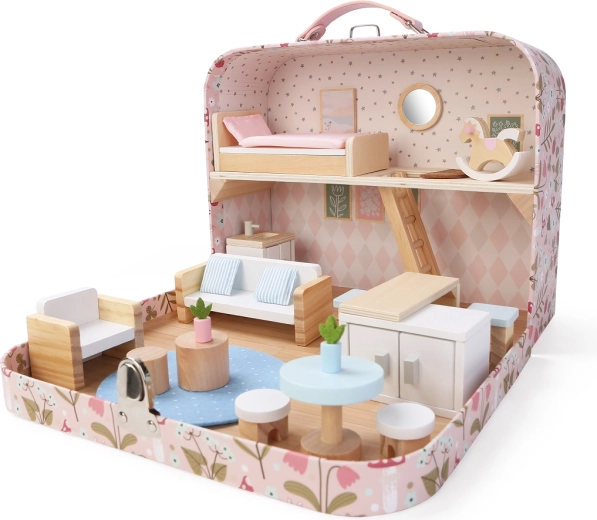 Ανακαλύψτε έναν μαγικό κόσμο εν κινήσει: φορητό κουκλόσπιτο κρυμμένο σε ένα κομψό βαλιτσάκι. Μόλις ανοίξει, μετατρέπεται σε ένα ζεστό σπίτι με μινιατούρες επίπλων και διακοσμήσεων. Ιδανικό για παιχνίδι στο σπίτι και στο ταξίδι, ενισχύει τη δημιουργικότητα και τη φαντασία των παιδιών. Περιλαμβάνει ξύλινο αλογάκι κούνια, κρεβατάκι, καναπέ, πολυθρόνα, σκάλα για τον επάνω όροφο και άλλα αξεσουάρ. Φορητό βαλιτσάκι, πλούσιος εξοπλισμός, εύκολη μεταφορά και διασκέδαση για παιδιά από 3 ετών.