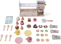 Ανοίξτε το δικό σας ζαχαροπλαστείο και καφετέρια με αυτό το ξύλινο σετ 2 σε 1 με 46 τεμάχια. Τα παιδιά θα απολαύσουν ρεαλιστικό παιχνίδι μπαρίστα και πωλητή χάρη στη μηχανή καφέ, τη βιτρίνα με γλυκά, τους στηρίκτες παγωτού, τις φλυτζάνες με πιατάκια, τα μαχαιροπήρουνα και τις συρταριέρες για χρήματα. Υποστηρίζει την δημιουργικότητα, την επικοινωνία και την ανάπτυξη λεξιλογίου.