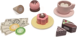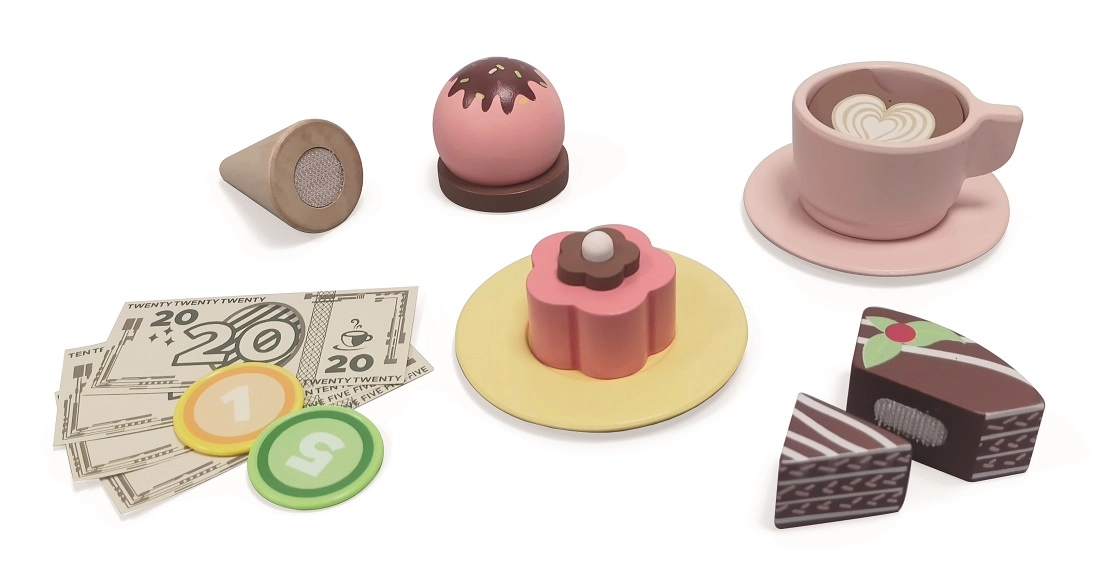 Φλυτζάνες με πιατάκια, γλυκά, μπάλες παγωτού, μαχαιροπήρουνα, κέρματα και χαρτονομίσματα – συνολικά 46 τεμάχια για άφθονα σενάρια παιχνιδιού.