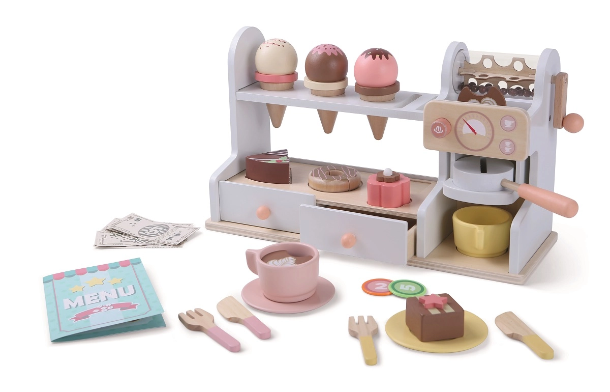 Αυτό το κομψό ξύλινο ζαχαροπλαστείο και καφετέρια 2 σε 1 μετατρέπει το παιδικό δωμάτιο σε μικρό μπιστρό. Ο συμπαγής πάγκος με μηχανή καφέ, βιτρίνα για γλυκά και ράφι με υποδοχές για μπάλες παγωτού προσκαλεί σε ατελείωτη διασκέδαση. Περιλαμβάνει επίσης ταμειακό συρτάρι με ψεύτικα χρήματα, ώστε τα παιδιά να εξασκούνται στην εξυπηρέτηση και την πληρωμή.