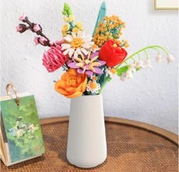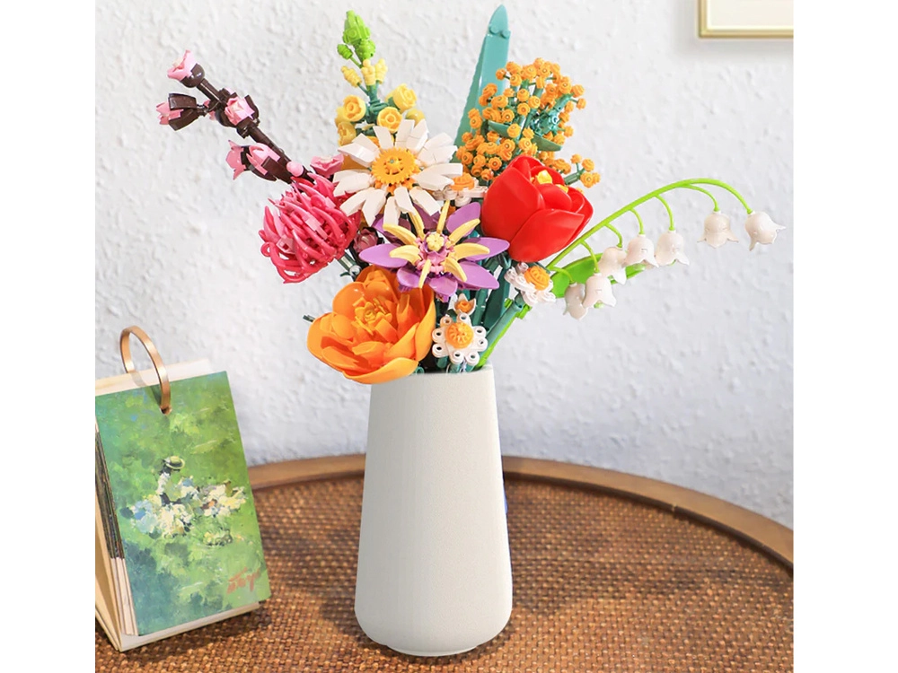 Αυτό το σχεδιαστικό σετ συνδυάζει δημιουργική συναρμολόγηση με μοντέρνα οικιακή διακόσμηση. Στο κουτί θα βρείτε ό,τι χρειάζεστε για να συνθέσετε μια πολύχρωμη ανθοδέσμη – από μικρές μαργαρίτες έως εντυπωσιακές χρυσανθέμες, όλα συμπληρωμένα με ένα ματ κεραμικό βάζο που προσφέρει σταθερότητα και καθαρή αισθητική στη σύνθεση.