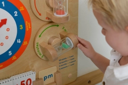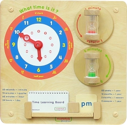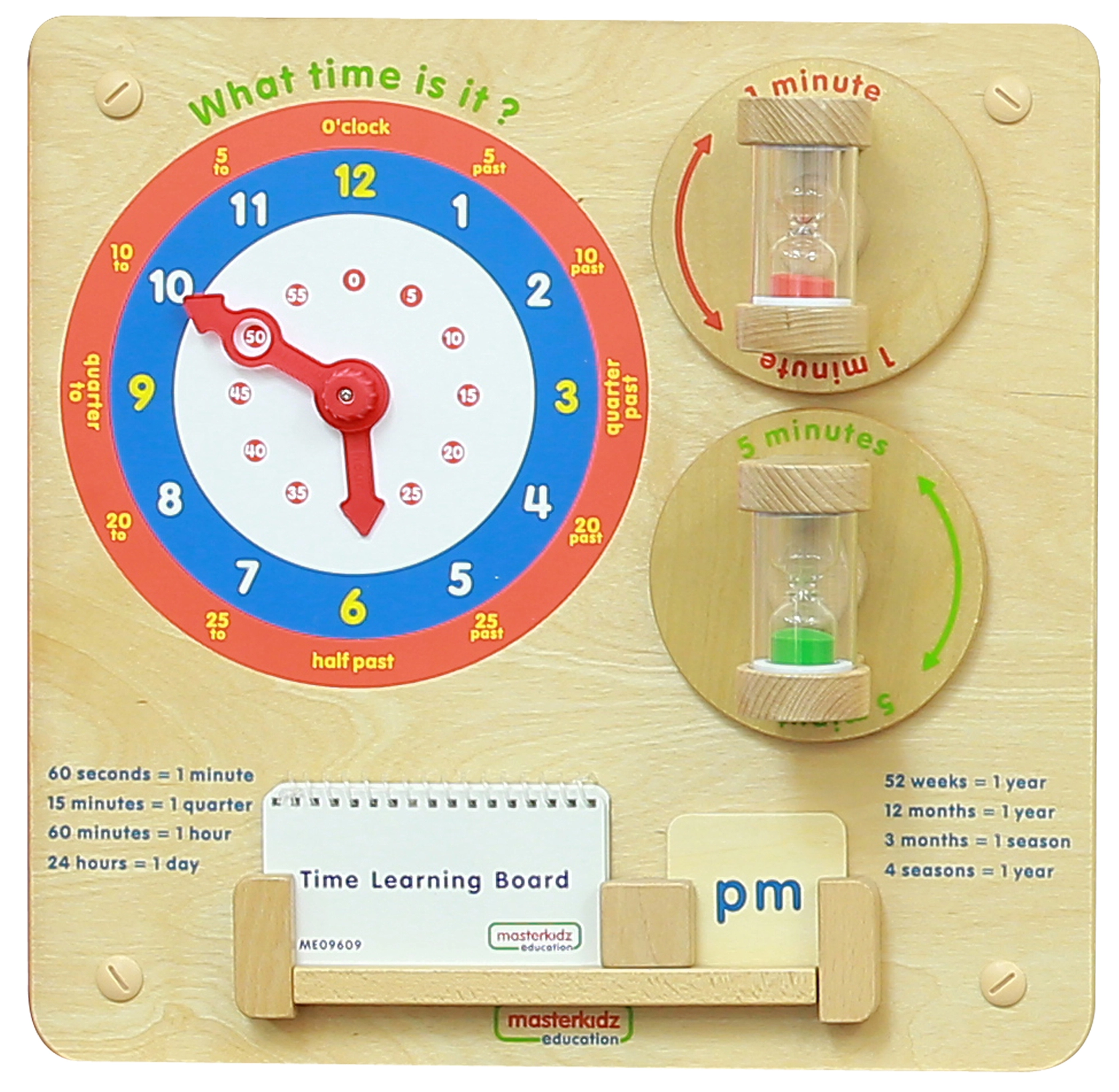 Ξύλινος εκπαιδευτικός πίνακας MASTERKIDZ διδάσκει τα παιδιά να διαβάζουν την ώρα σε κλασικό ρολόι, να κατανοούν λεπτά, ώρες και ημέρες και να αντιλαμβάνονται τη διάρκεια του χρόνου μέσω δύο κλεψύδρων (1 και 5 λεπτών). Ανθεκτική κατασκευή για τοίχο ή για το σύστημα Masterkidz Flex, με κινητούς δείκτες και ευανάγνωστες επισημάνσεις που ενισχύουν τη λογική σκέψη, τη λεπτή κινητικότητα και το αυτόνομο παιχνίδι.