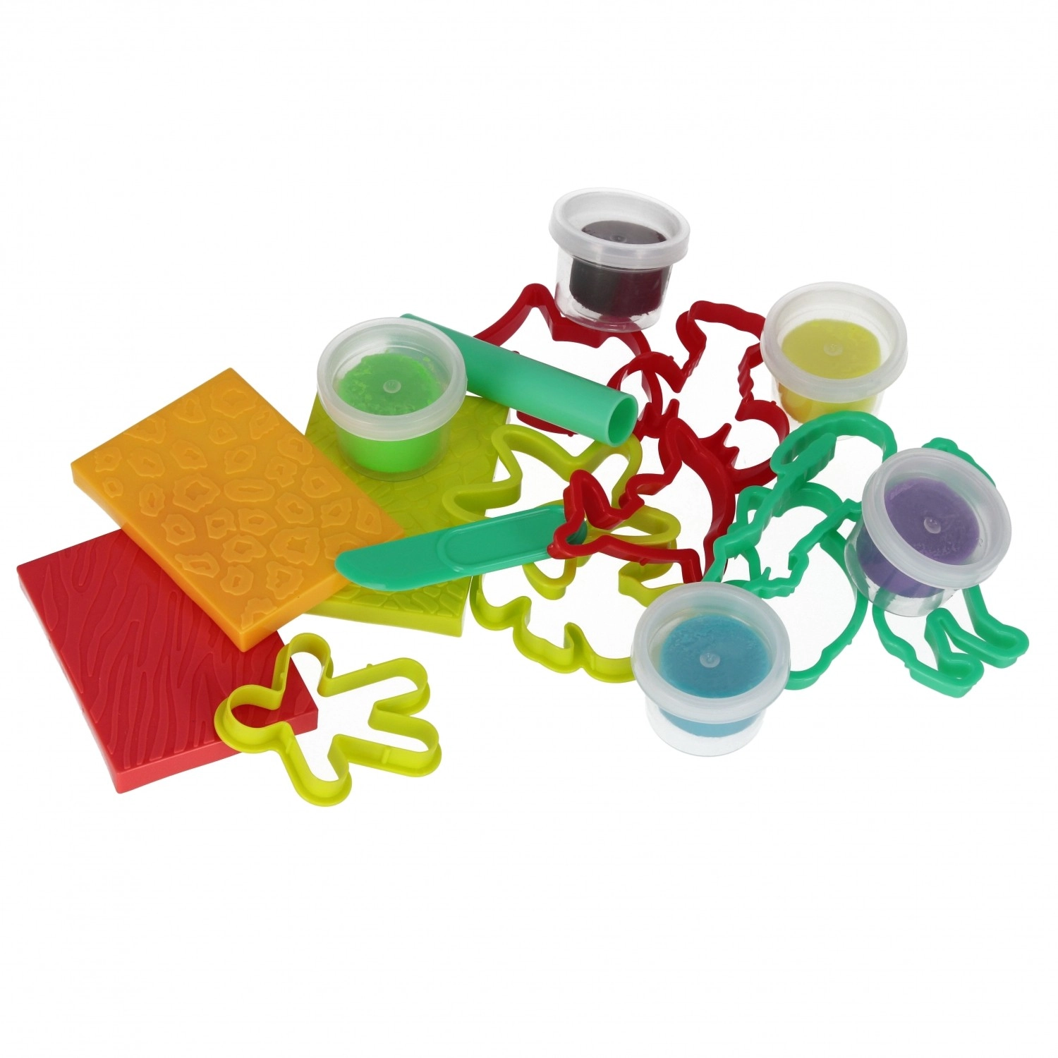 Κυπελλάκια με πολύχρωμη πλαστελίνη, κουπ πατ, σφραγίδες, πλάστης και μαχαιράκι. Τα παιδιά μπορούν να αρχίσουν να δημιουργούν αμέσως μετά το άνοιγμα – χωρίς επιπλέον αγορές.