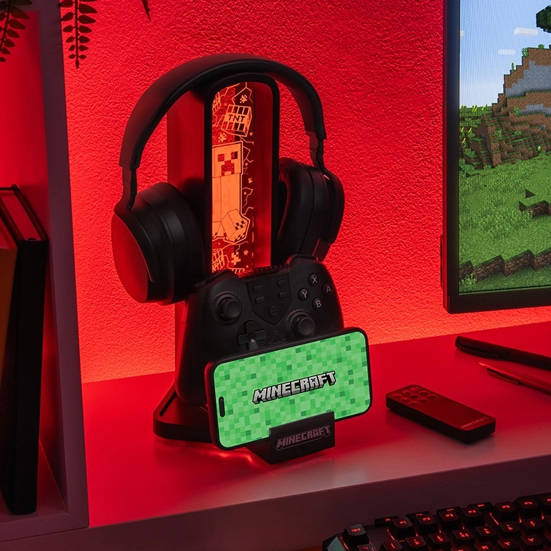 Στιλάτη βάση για ακουστικά εμπνευσμένη από τον κόσμο του Minecraft, εντυπωσιάζει με ύψος 30 cm, πολύχρωμους φωτεινούς τρόπους, πρακτικό στήριγμα τηλεφώνου και ζεύγος θυρών USB‑C για φόρτιση αξεσουάρ. Ο χειρισμός είναι άνετος χάρη στο τηλεχειριστήριο και την τροφοδοσία μέσω καλωδίου USB, που περιλαμβάνεται στη συσκευασία.