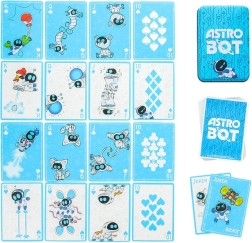 Στιλάτα χαρτιά τράπουλας ASTROBOT με τζόκερ σε ανθεκτικό μεταλλικό κουτί, ιδανικά για παιχνίδια στο σπίτι και για ταξίδια. Η συσκευασία περιλαμβάνει 54 κάρτες συμπεριλαμβανομένων των τζόκερ, προσφέρει μεγάλη αντοχή και άνετη αποθήκευση χωρίς τσαλάκωμα.