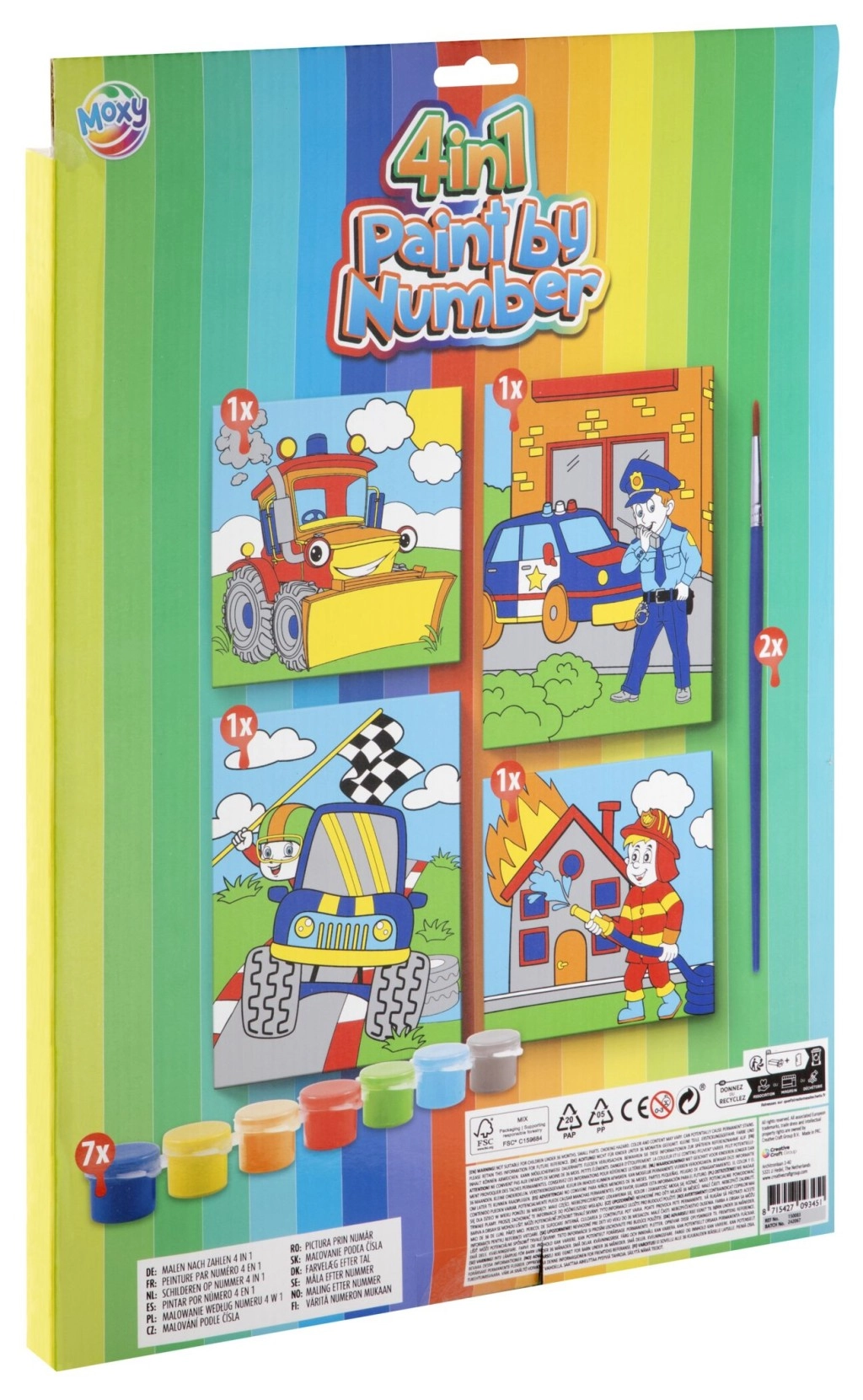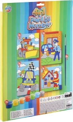 - 4 προεκτυπωμένες χάρτινες εικόνες, σετ ακρυλικών χρωμάτων, πινέλο, οδηγίες