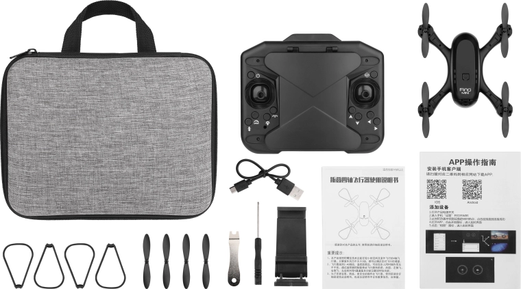 - Πλούσιες λειτουργίες: αυτόματη απογείωση/προσγείωση, έκτακτη προσγείωση, περιστροφές 360°, 3 ταχύτητες, headless mode.