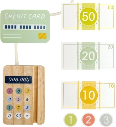 Το σετ περιλαμβάνει όλα όσα χρειάζεται ο μικρός πωλητής: ξύλινο ταμείο με πολύχρωμα κουμπιά, σαρωτή, αναγνώστη καρτών, κάρτα πληρωμής, κέρματα και χαρτονομίσματα. Το παιχνίδι αναπτύσσει τη λογική σκέψη, τις μαθηματικές δεξιότητες, τις ικανότητες συντονισμού και την επικοινωνία στο παιχνίδι ρόλων μεταξύ πωλητή και πελάτη.