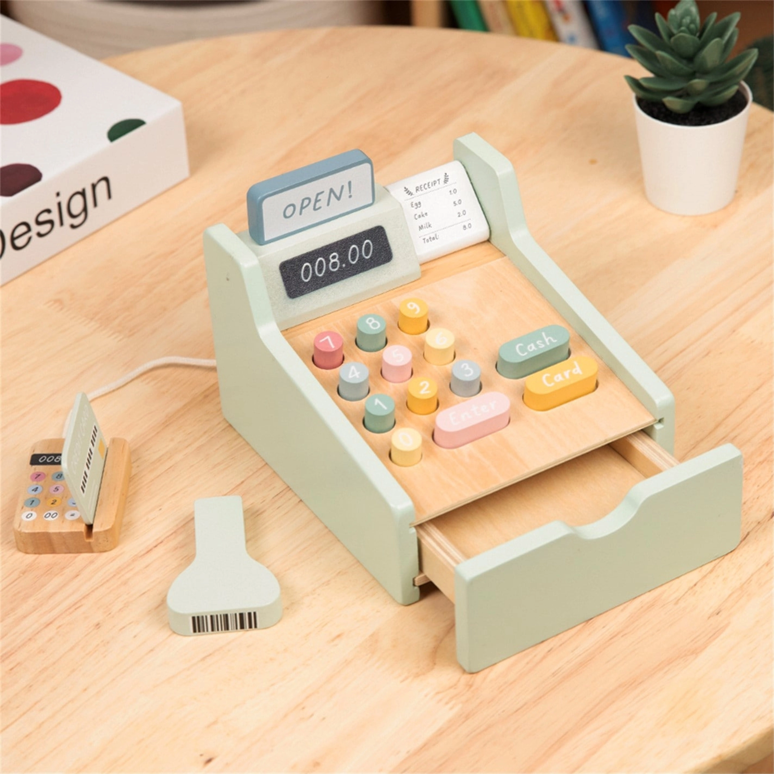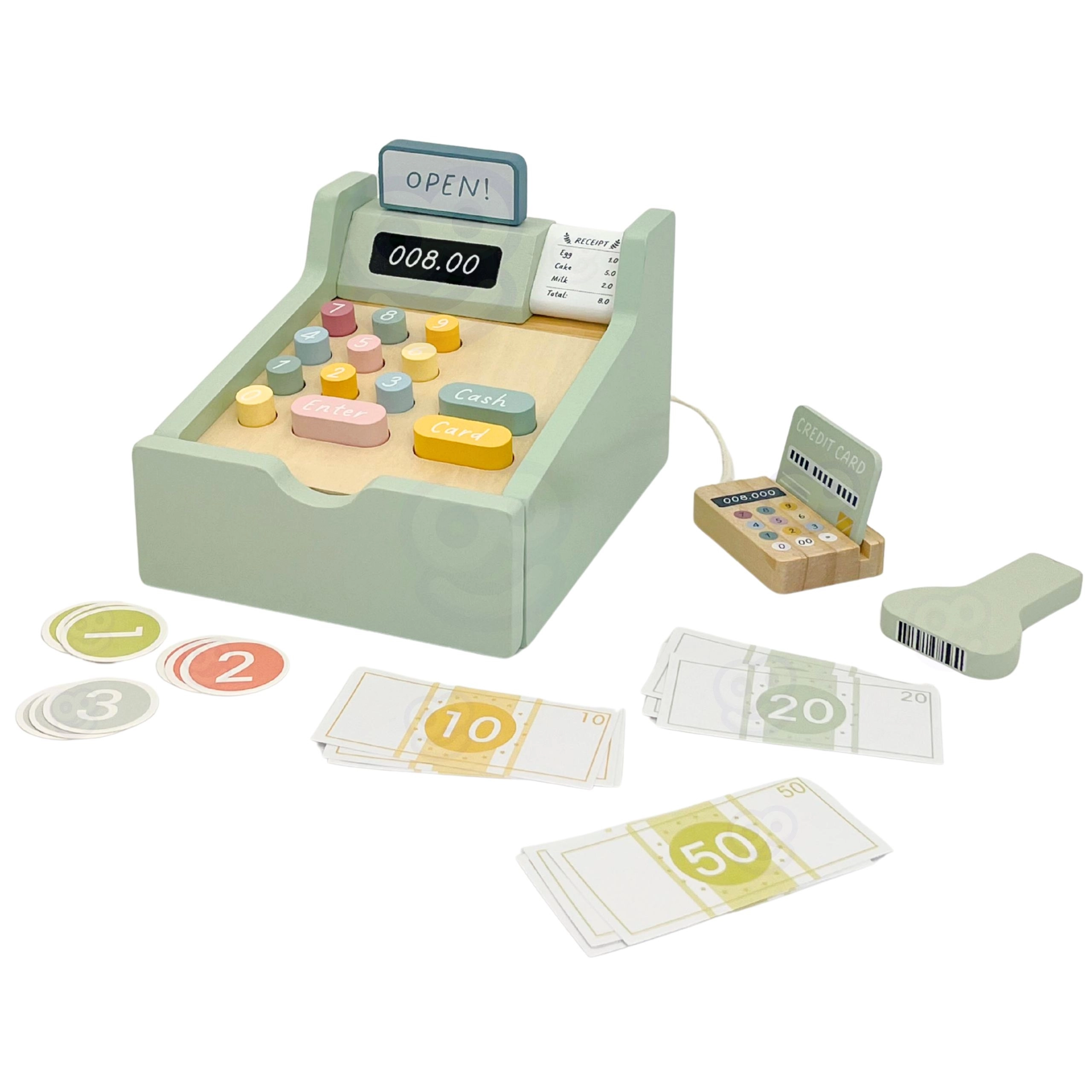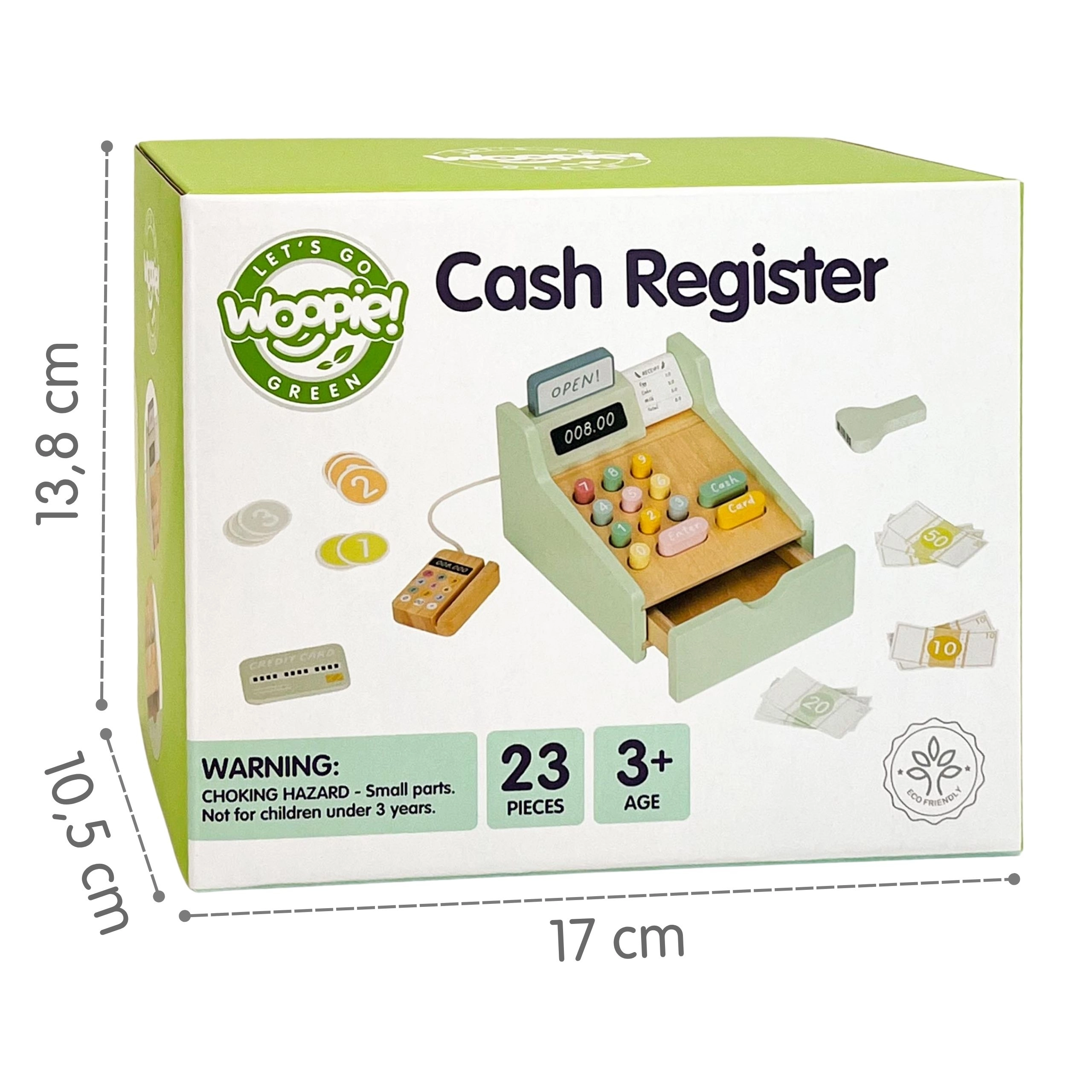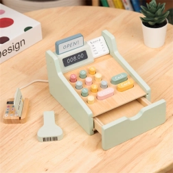 Μετατρέψτε τη γωνιά παιχνιδιού σε δικό σας μικρό κατάστημα με αυτό το πανέμορφο ξύλινο ταμείο WOOPIE GREEN. Παστέλ χρώματα, ποιοτικό ξύλο και πλούσια αξεσουάρ υποστηρίζουν τη δημιουργική παιχνίδι, την εκμάθηση αριθμητικής και την ανάπτυξη λεπτής κινητικότητας. Περιλαμβάνονται σαρωτής, αναγνώστης καρτών, κάρτα πληρωμής, χαρτονομίσματα και κέρματα για ρεαλιστικό παιχνίδι καταστήματος.