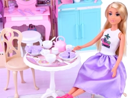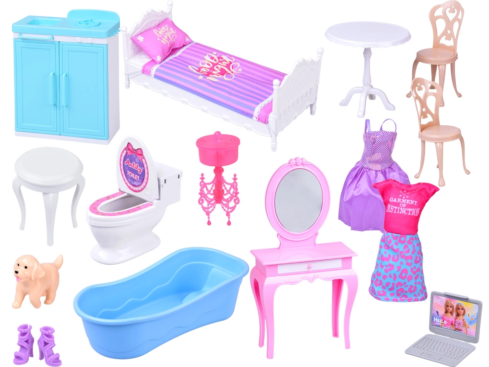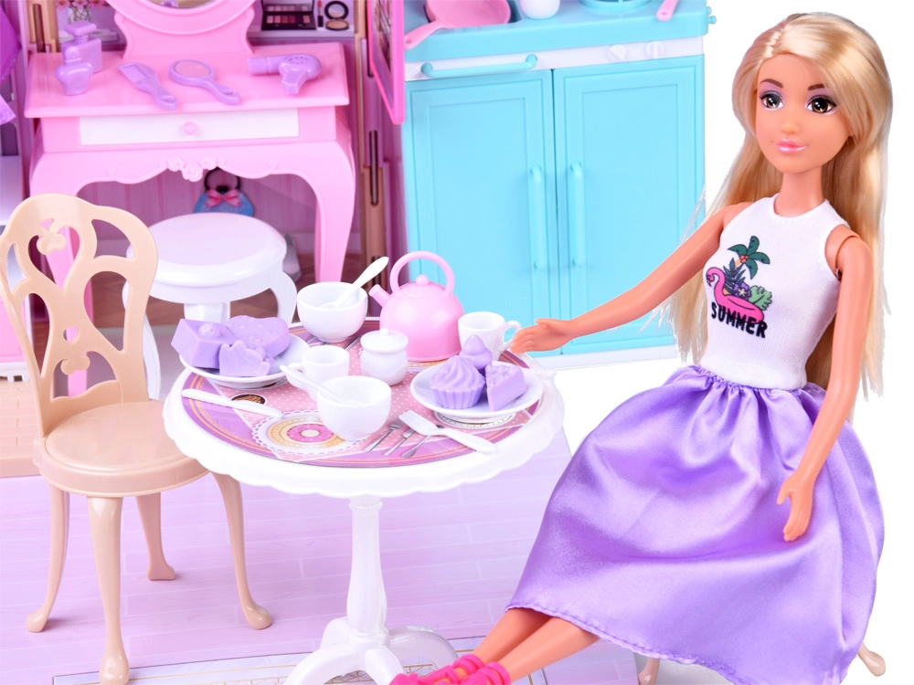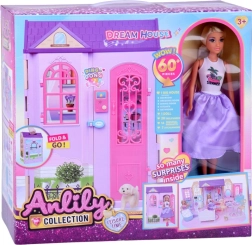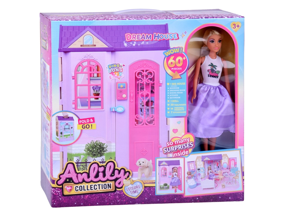 Περιλαμβάνεται κούκλα ANLILY με μακριά μαλλιά ιδανικά για χτένισμα, έπιπλα (κρεβάτι με σκεπάσματα, ντουλάπα με συρτάρια, κρεμάστρα, μπανιέρα, WC, τουαλέτα μακιγιάζ με σκαμπό, σετ τραπεζαρίας), εξοπλισμός κουζίνας και πολλά αξεσουάρ για περιποίηση και μαγείρεμα. Ανοιγόμενες πόρτες και παράθυρα, διακοσμήσεις και κουδούνι με μπαταρία υποστηρίζουν το ρεαλιστικό παιχνίδι ρόλων.