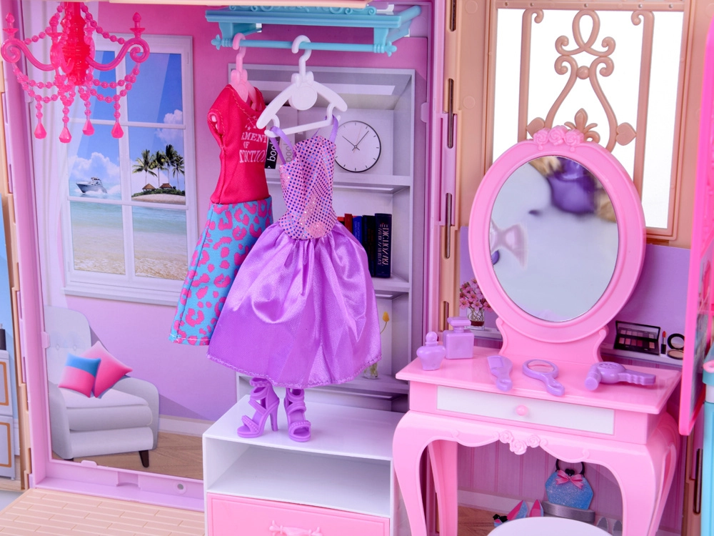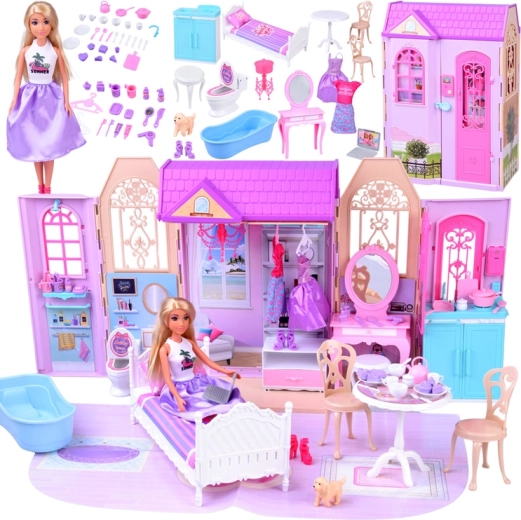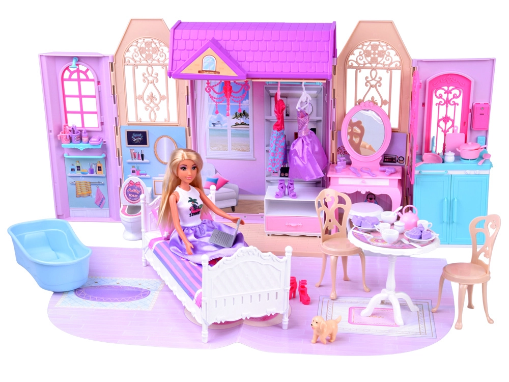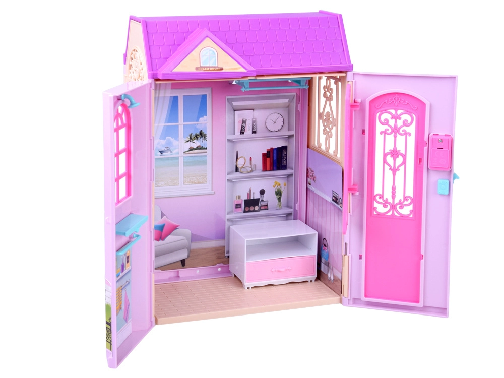 Το πτυσσόμενο ροζ-μωβ κουκλόσπιτο έχει σχεδιαστεί σαν πρακτικό βαλιτσάκι, ώστε τα παιδιά να το παίρνουν εύκολα στον παιδικό σταθμό, στις διακοπές ή σε φίλους. Όταν ανοίγει, δημιουργεί ένα ζεστό μίνι σπίτι με τρεις πλήρως εξοπλισμένες ζώνες: μπάνιο για χαλαρωτικά μπάνια, κρεβατοκάμαρα με τουαλέτα για styling και ξεκούραση και κουζίνα – την καρδιά κάθε σπιτιού.