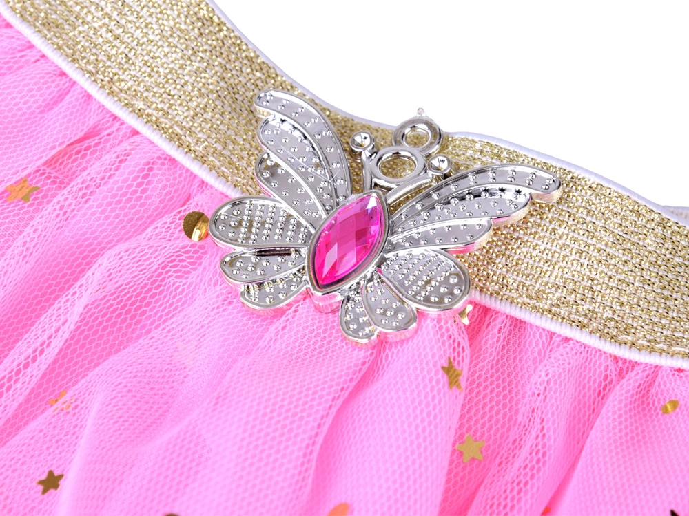 Μαγέψτε τη φαντασία του παιδιού με αυτό το μαγικό σετ μεταμφίεσης: ροζ λαμπερή φούστα με χρυσή ελαστική μέση, ασημί κορόνα με ροζ πετράδια, κολιέ με πεταλούδα, δαχτυλίδι και σκουλαρίκια πεταλούδας. Ιδανικό για παραμυθένιο παιχνίδι, γενέθλια και αποκριάτικες εμφανίσεις.
