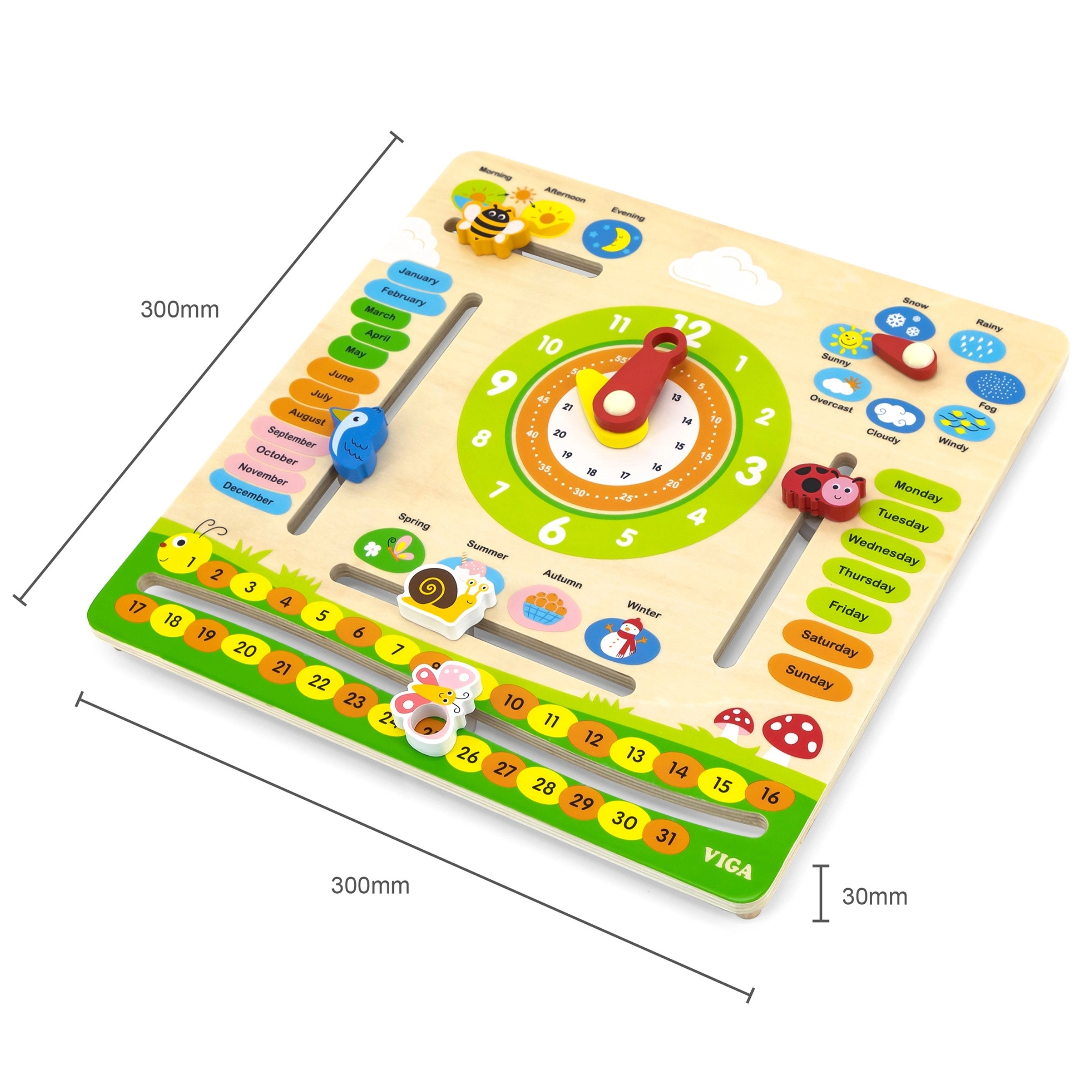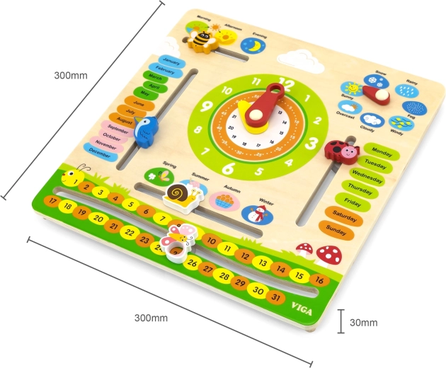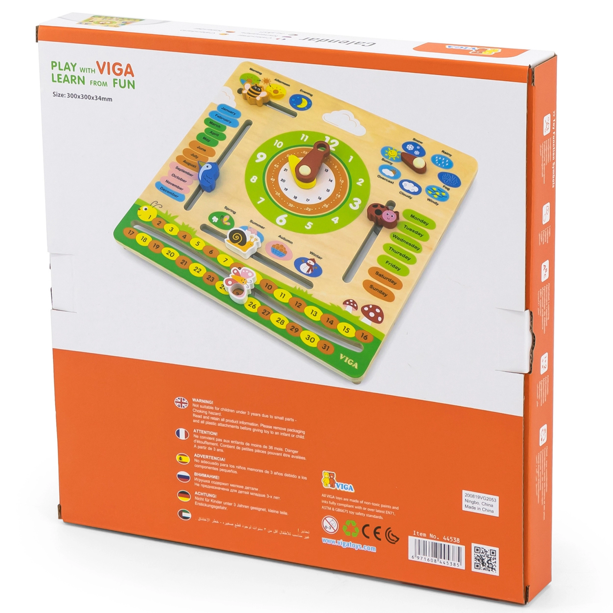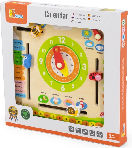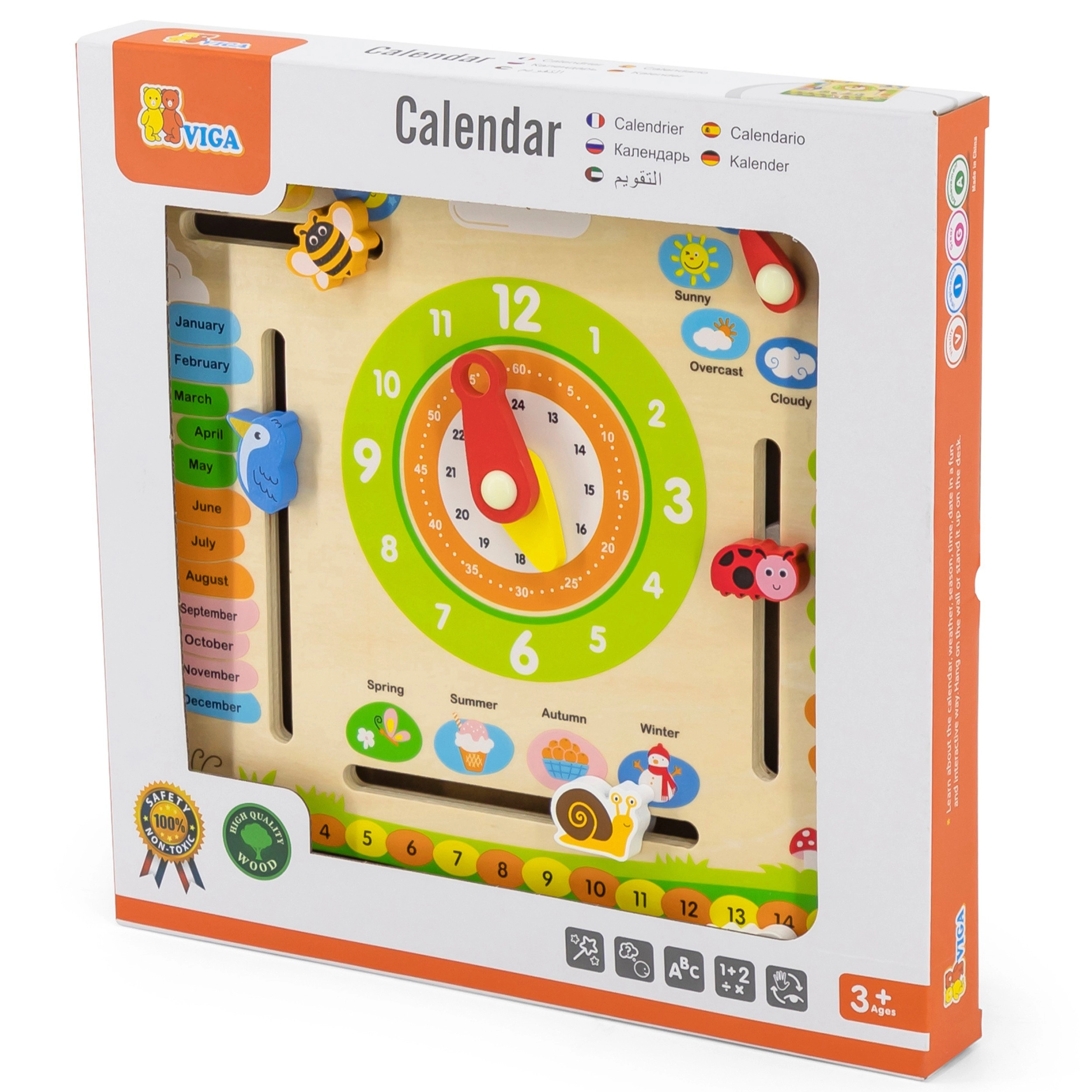 Ανακαλύψτε την ώρα, τις ημέρες, τους μήνες και τον καιρό με το ξύλινο εκπαιδευτικό ημερολόγιο με ρολόι της Viga. Αυτός ο ποιοτικός, ασφαλής και πολύχρωμος βοηθός υποστηρίζει την εκμάθηση αγγλικής γλώσσας, την εξάσκηση ανάγνωσης της ώρας σε αναλογικό ρολόι και την ανάπτυξη λογικής και λεπτής κινητικότητας. Εξαιρετικό συμπλήρωμα για το σπίτι, τον παιδικό σταθμό και το σχολείο και κατάλληλο για προσέγγιση Montessori.