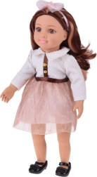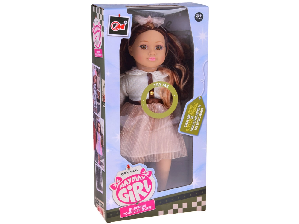 Η γοητευτική κούκλα MAY MAY GIRL ξεχωρίζει με τον συνδυασμό ρεαλιστικών λεπτομερειών και ποιοτικής κατασκευής. Το λευκό υφασμάτινο μπλουζάκι με χρυσά κουμπάκια, η λαμπερή ροζ φούστα με ζώνη και η στέκα με φιόγκο δημιουργούν ένα κομψό σετ μόδας που ενθαρρύνει τη φαντασία και το στυλάτο ντύσιμο-ξεγύμνωμα.