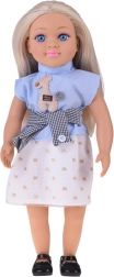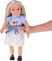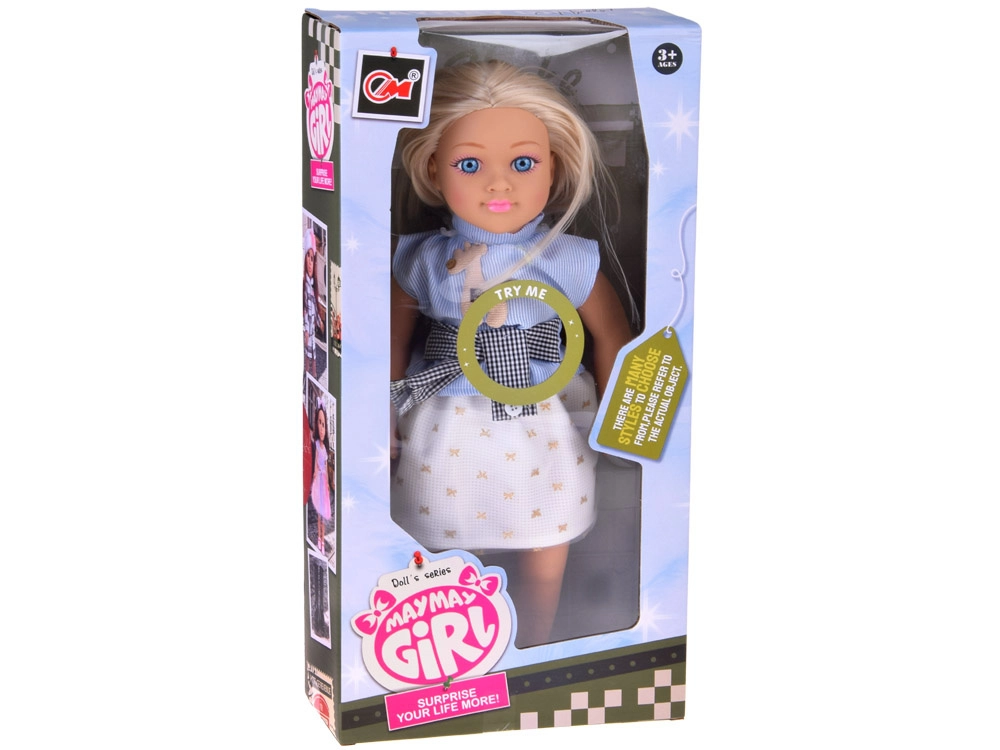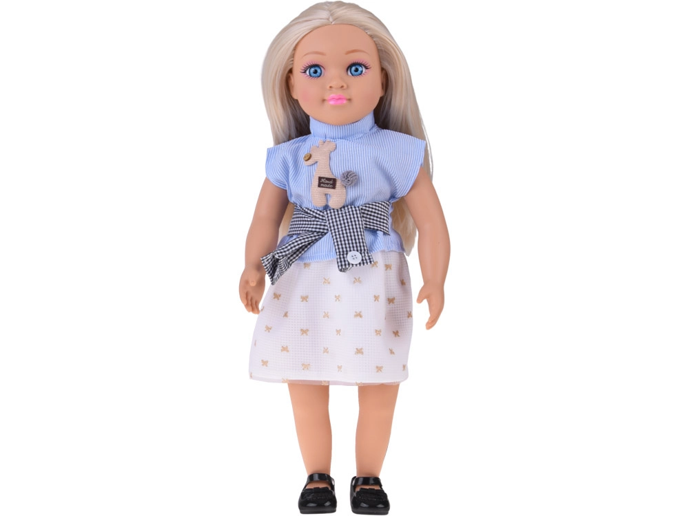 Η κούκλα είναι ντυμένη με κομψό συνδυασμό – μπλε τοπ με ρίγες και διακόσμηση, σικ ζώνη και κρεμ φούστα με χρυσά μοτίβα, ένα αρμονικό σύνολο που ολοκληρώνεται με μαύρες μπαλαρίνες. Χάρη στα κινούμενα χέρια, πόδια και κεφάλι μπορεί να καθίσει εύκολα και να στηθεί σε διάφορες πόζες για σκηνές και αφήγηση ιστοριών.