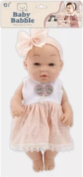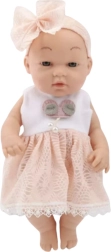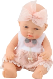 Αυτή η κούκλα-μωρό γοητεύει με το κομψό ροζ φόρεμα με δαντελένιο τελείωμα και τη ταιριαστή στέκα με μεγάλο φιόγκο. Τα απαλά χαρακτηριστικά του προσώπου και τα ευχάριστα υλικά δημιουργούν την αίσθηση ενός αληθινού μωρού που τα παιδιά θα αγαπήσουν γρήγορα.