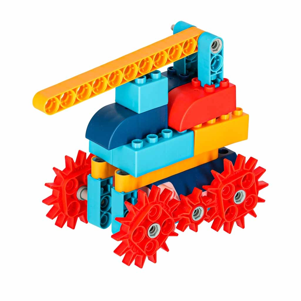 Γρανάζια διαφόρων μεγεθών, άξονες και σύνδεσμοι επιτρέπουν μεταδόσεις και περιστροφή. Τα παιδιά γνωρίζουν στην πράξη τις αρχές της μηχανικής και της μετάδοσης κίνησης.