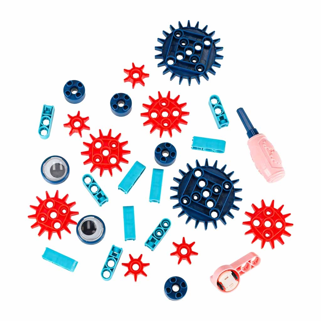 - Μπλοκ μοτέρ, μπλοκ με ροδάκια, οδοντωτοί τροχοί, σύνδεσμοι, δομικά τουβλάκια, διακοσμητικά μάτια, σετ βιδών, κατσαβίδι, καλώδιο USB, οδηγός