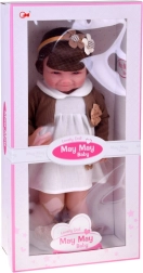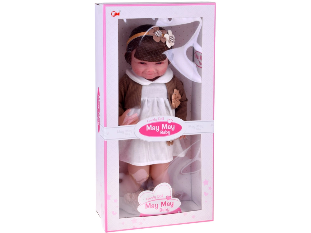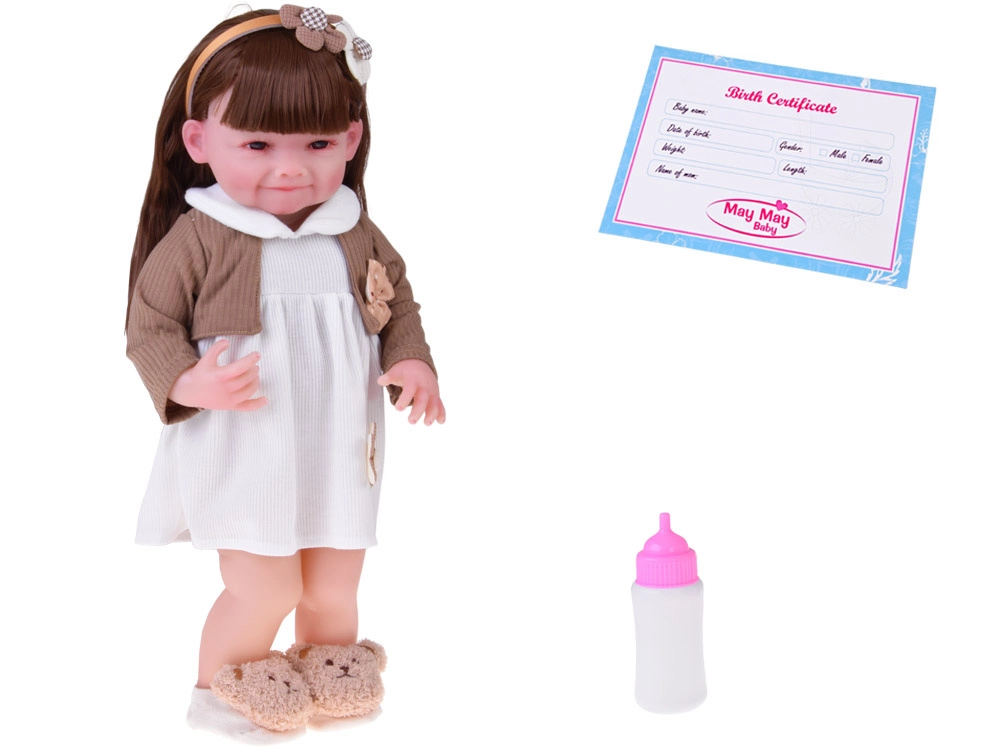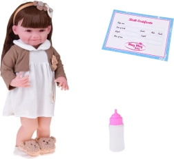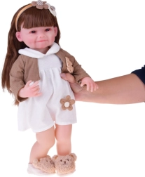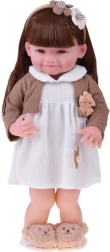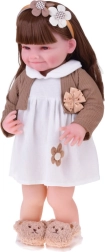 Αυτή η όμορφη κούκλα φορά λευκό φορεματάκι με λουλουδένια εφαρμογή και καφέ ζακετάκι με κορδελίτσα. Το σύνολο συμπληρώνουν μαλακές παντόφλες σε σχήμα αρκουδίτσας και μπεζ στέκα με διακόσμηση, που αναδεικνύουν την απαλή, παιδικά γλυκιά εμφάνιση. Χάρη στο ρεαλιστικό πρόσωπο και τα μακριά μαλλιά, τα παιδιά απολαμβάνουν ώρες δημιουργικού παιχνιδιού.
