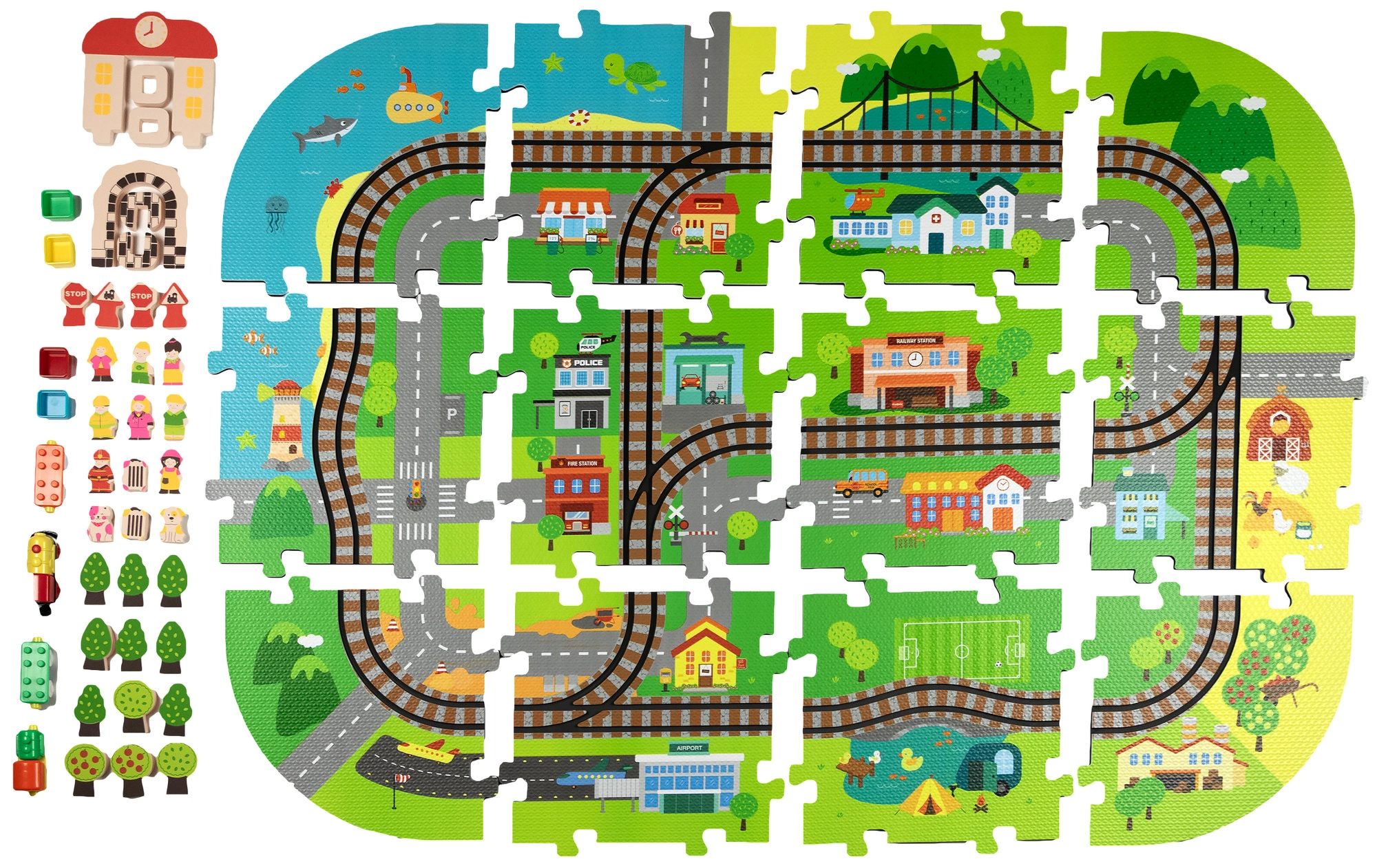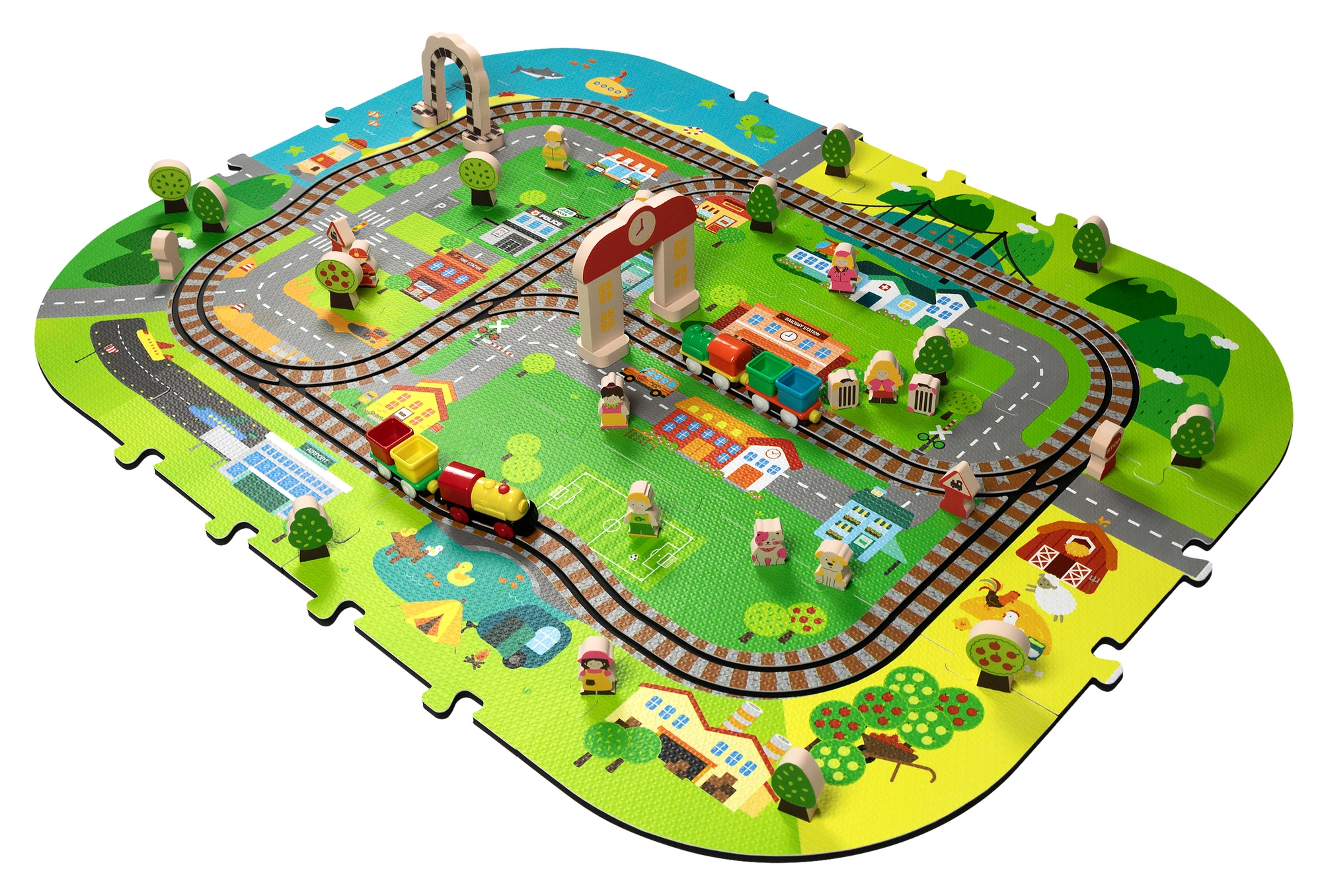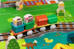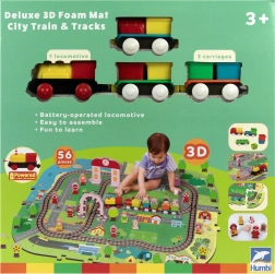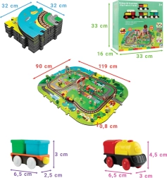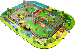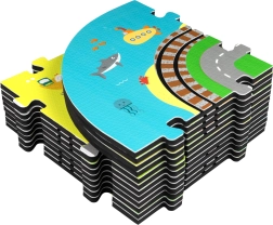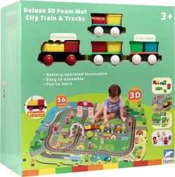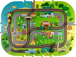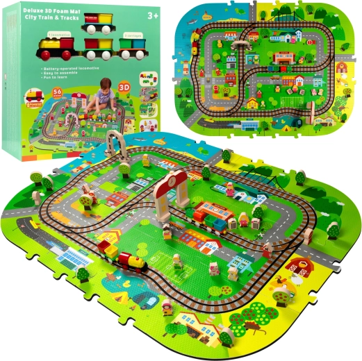 Αυτό το δημιουργικό σετ συνδυάζει ένα μαλακό χαλάκι δαπέδου με μια 3D πόλη και σιδηροτροχιές. Τα παιδιά στήνουν μια πολύχρωμη σκηνή με δρομάκια, κτίρια, αεροδρόμιο, φάρμα, θάλασσα, κάμπινγκ και βουνά και αφήνουν τη μηχανή με μπαταρίες να κινείται ομαλά πάνω στη συναρμολογημένη διαδρομή. Τα χοντρά κομμάτια αφρού EVA απορροφούν τους κραδασμούς, μονώνουν από το κρύο και δημιουργούν ασφαλή χώρο για παιχνίδι.