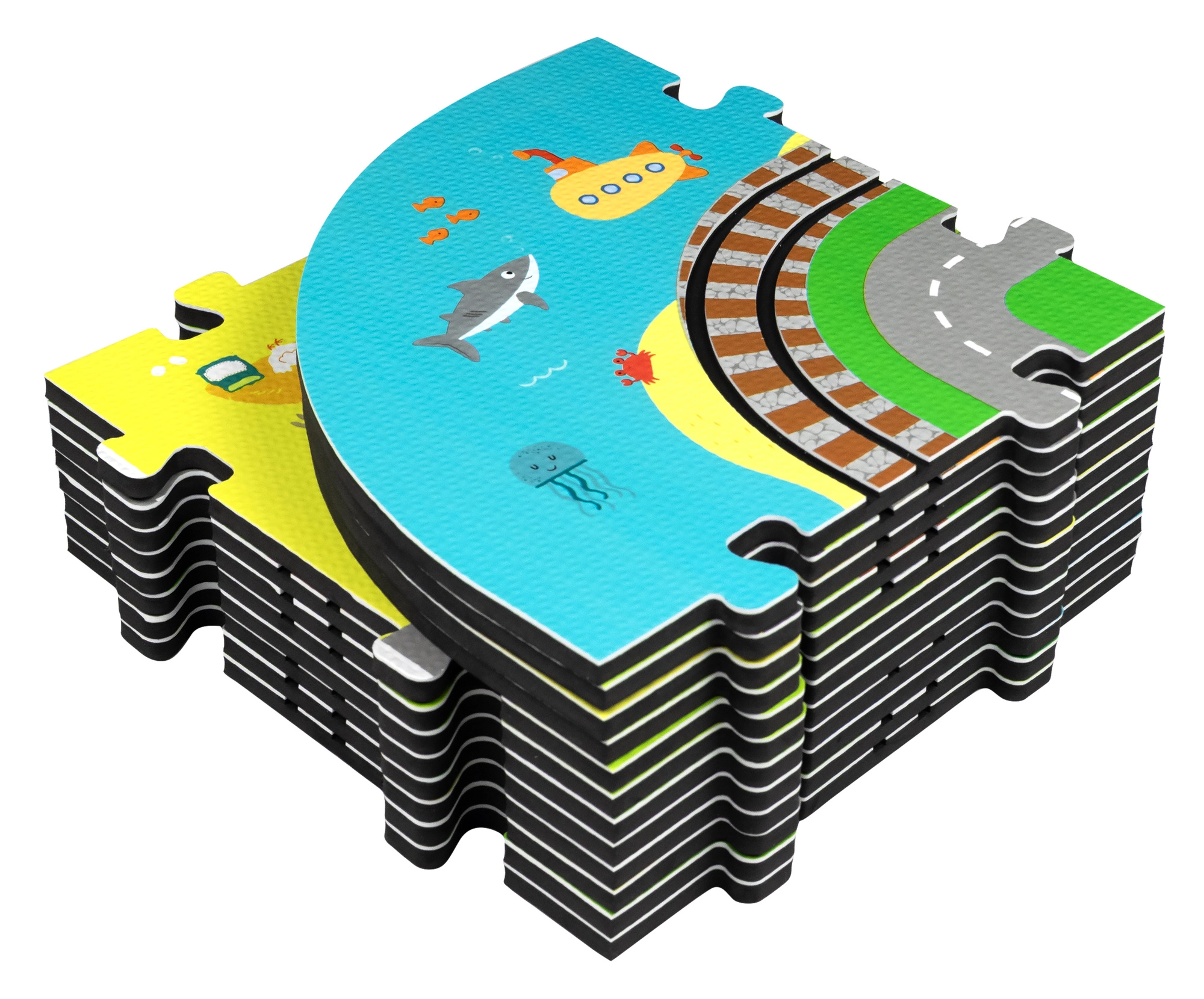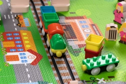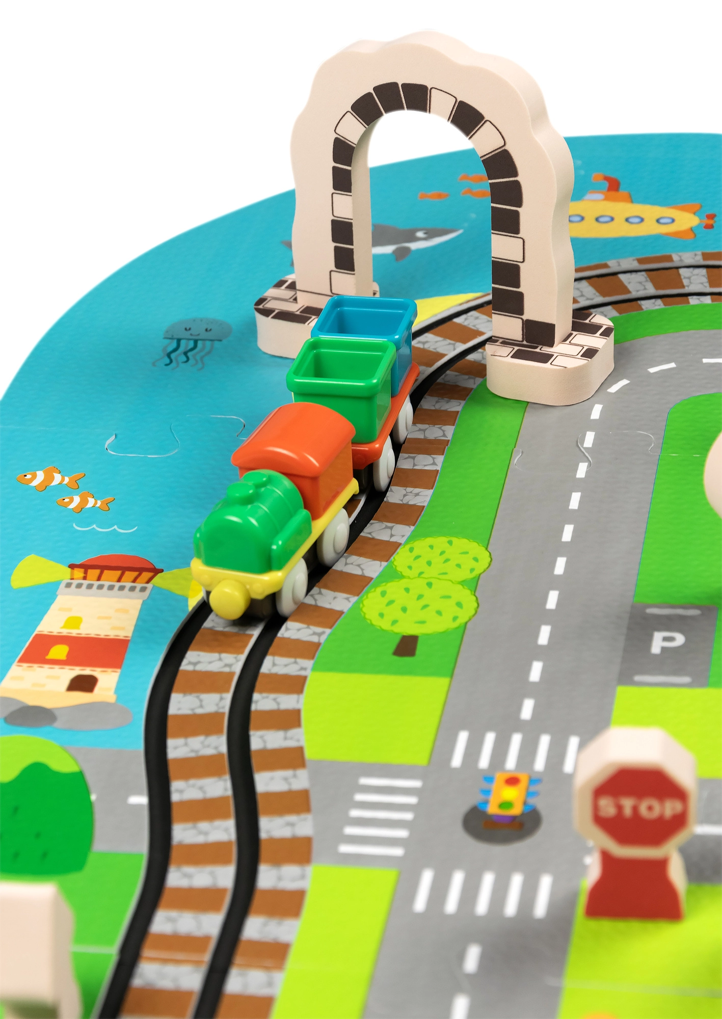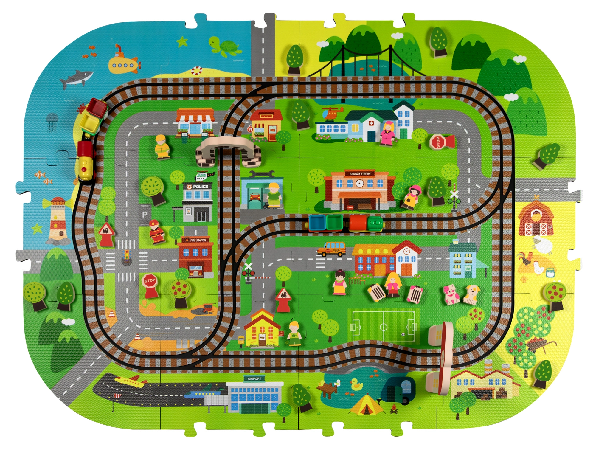 Αυτό το δημιουργικό σετ συνδυάζει ένα μαλακό χαλάκι δαπέδου με μια 3D πόλη και σιδηροτροχιές. Τα παιδιά στήνουν μια πολύχρωμη σκηνή με δρομάκια, κτίρια, αεροδρόμιο, φάρμα, θάλασσα, κάμπινγκ και βουνά και αφήνουν τη μηχανή με μπαταρίες να κινείται ομαλά πάνω στη συναρμολογημένη διαδρομή. Τα χοντρά κομμάτια αφρού EVA απορροφούν τους κραδασμούς, μονώνουν από το κρύο και δημιουργούν ασφαλή χώρο για παιχνίδι.