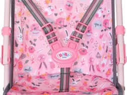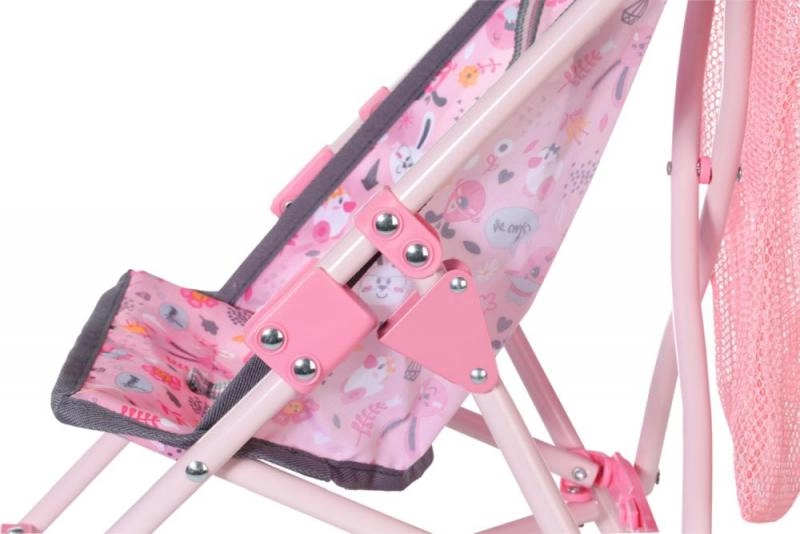 Κάθισμα με χαρούμενο μοτίβο και ζώνες ασφαλείας που κρατούν την κούκλα σταθερά και άνετα στη θέση της σε όλη τη βόλτα.