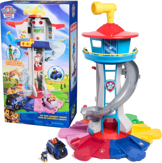 Ζήστε δράση σαν στην ταινία με τον πύργο My Size Lookout Tower ύψους πάνω από 81 εκ. από το PAW PATROL. Τα παιδιά θα εντυπωσιαστούν από τα φωτεινά και ηχητικά εφέ, τον ανελκυστήρα, το περιστρεφόμενο περισκόπιο και την μακριά τσουλήθρα προς τον εκτοξευτή. Περιλαμβάνει φιγούρα του Chase και το περιπολικό του – έτοιμα για δράση αμέσως μόλις ανοιχτεί η συσκευασία.