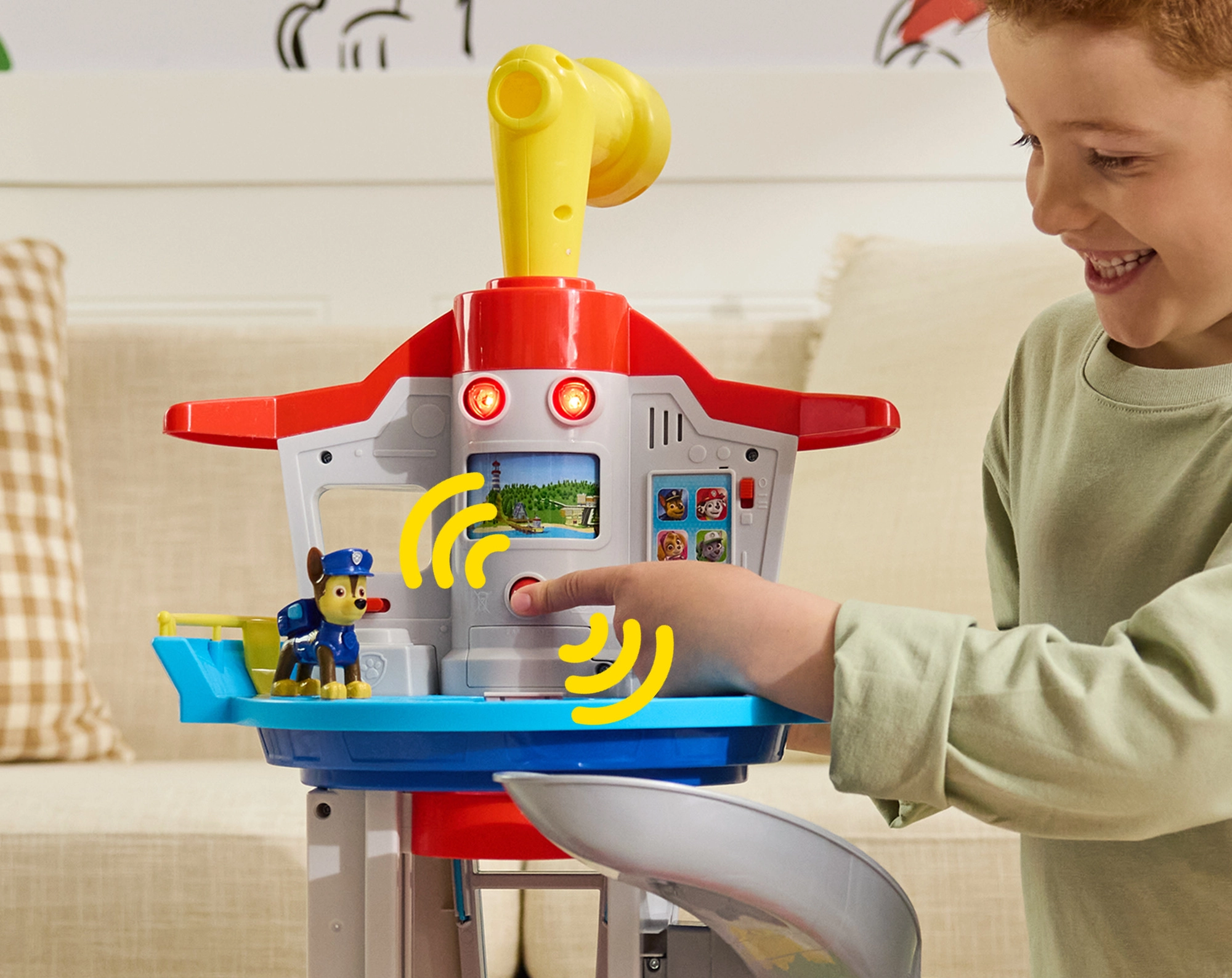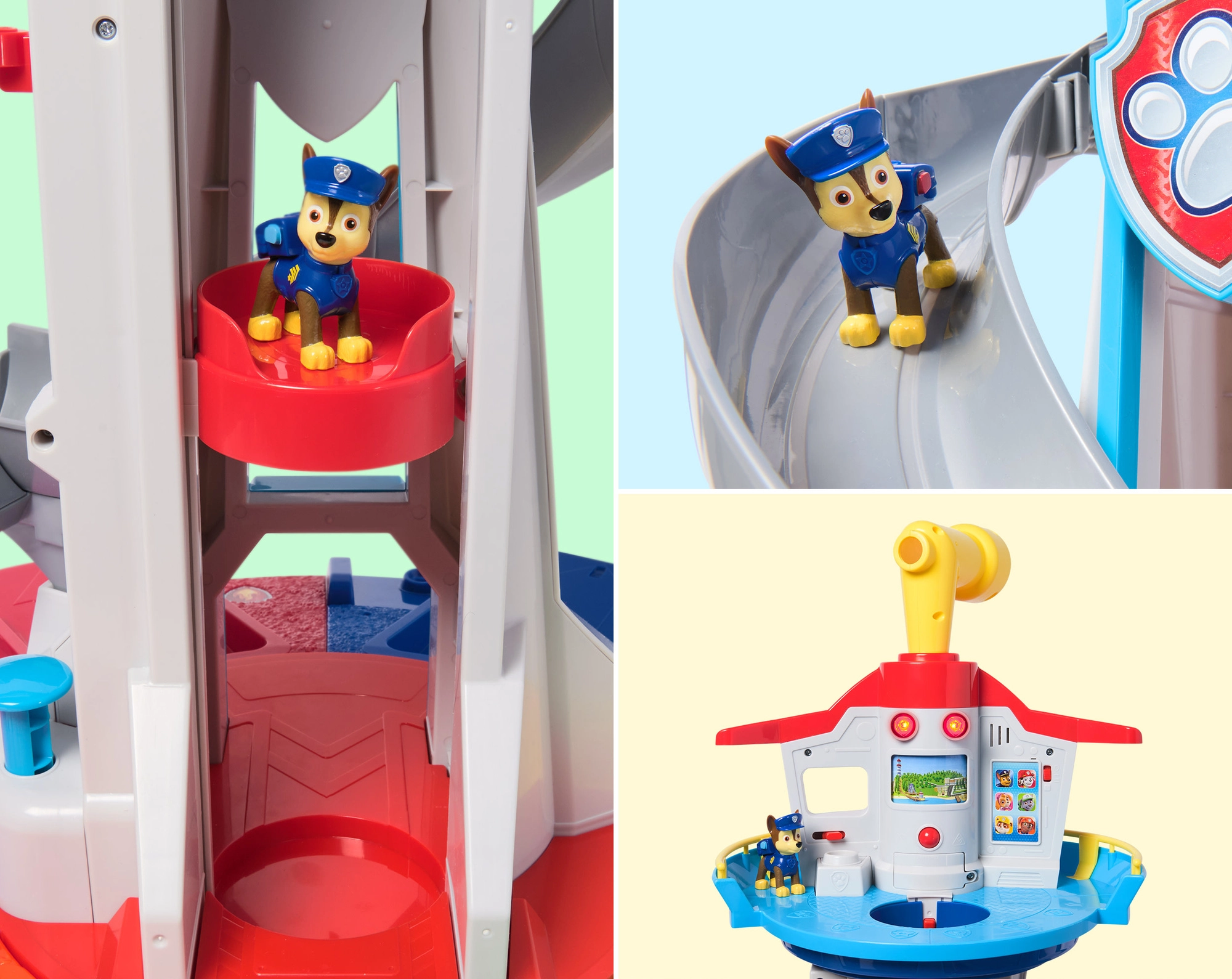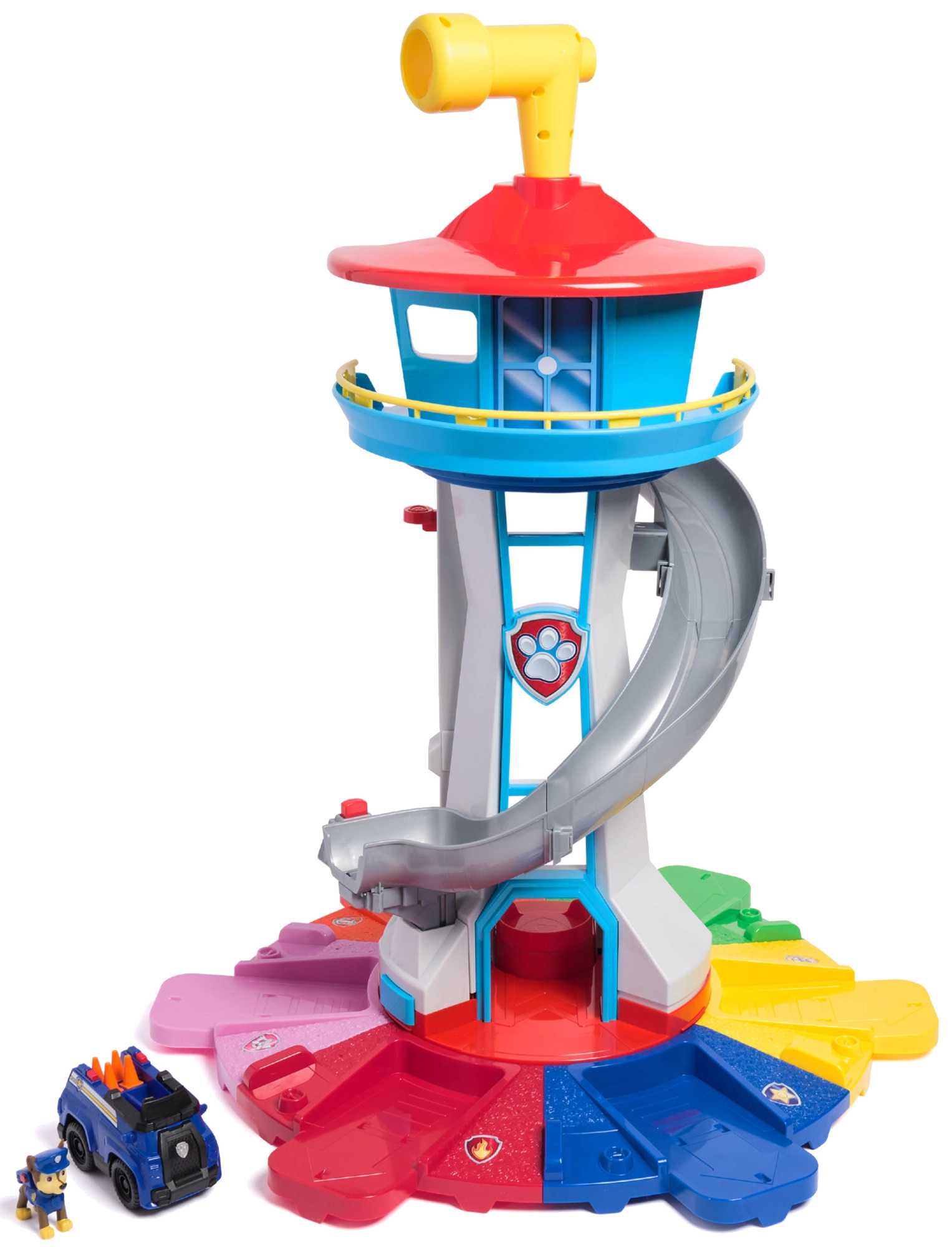 Η εμβληματική βάση από το PAW PATROL προσφέρει στα παιδιά ατελείωτες δυνατότητες παιχνιδιού. Αφού επιλέξετε αποστολή από τον πίνακα με κουμπιά και εφέ, ανεβάστε τον Chase με τον ανελκυστήρα στην κορυφή, ρίξτε μια ματιά με το περιστρεφόμενο περισκόπιο και ξεκινήστε τη γενναία διάσωση από την φαρδιά τσουλήθρα κατευθείαν στην περιστρεφόμενη εκτοξευόμενη ράμπα.