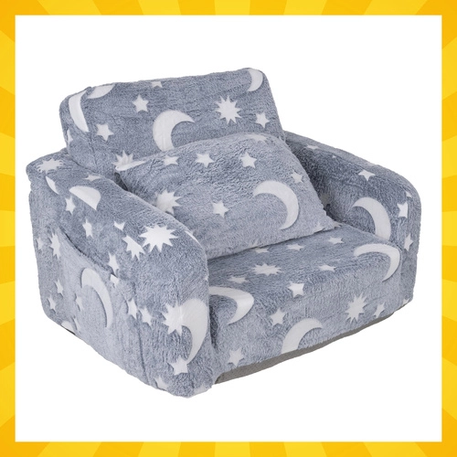 Απαλή άνεση και διασκέδαση σε ένα – η αναδιπλούμενη παιδική πολυθρόνα Kruzzel μετατρέπεται εύκολα σε σεζλόνγκ για διάβασμα, ξεκούραση και παραμύθια. Ελαφριά, ασφαλής και εύκολη στη μεταφορά, με πρακτική πλαϊνή τσέπη και απαλό βελουτέ κάλυμμα. Τα φθορίζοντα φεγγάρια και αστεράκια λάμπουν διακριτικά στο σκοτάδι δημιουργώντας ήρεμη ατμόσφαιρα για γαλήνιο ύπνο.