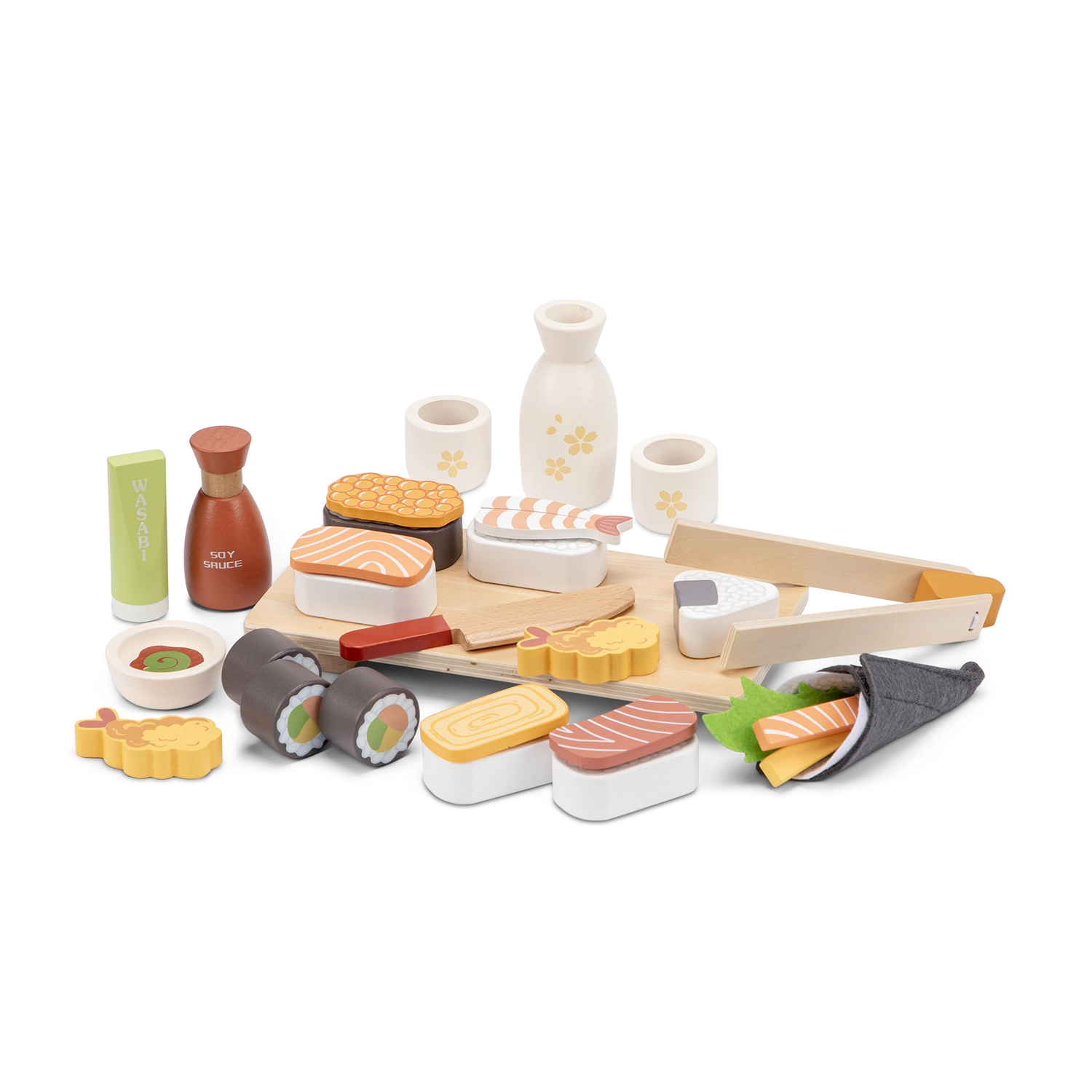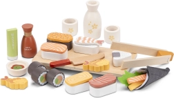 Αυτό το πλούσια εξοπλισμένο σετ επιτρέπει στα παιδιά να ετοιμάσουν το δικό τους «τραπέζι» – από νιγκίρι και ρολά μέχρι wasabi και σόγια σος. Περιλαμβάνονται δίσκος σερβιρίσματος, ξυλάκια με παιδική λαβή, μαχαίρι, μπολ, λαβίδες/ξυλάκια και ακόμη μπουκάλι με σάκε με φλιτζανάκια. Κάθε κομμάτι είναι λεπτομερώς ζωγραφισμένο για ρεαλιστική αίσθηση.