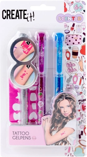 Ανακάλυψε τη δημιουργικότητά σου με τα αρωματικά τζελ στυλό τατουάζ CREATE IT!. Ένα σετ από τρία λαμπερά στυλό και στένσιλ σου επιτρέπει να δημιουργείς προσωρινά τατουάζ με φρουτώδες άρωμα μήλου και μύρτιλου. Το μελάνι ξεπλένεται εύκολα με νερό, τα προϊόντα είναι δερματολογικά ελεγμένα, χωρίς parabens και χωρίς δοκιμές σε ζώα – ασφαλή για παιδιά 6–14 ετών.