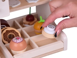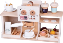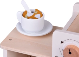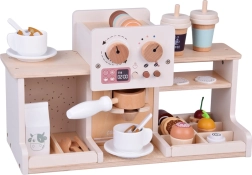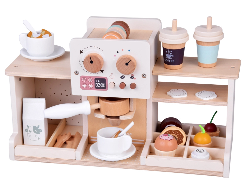 Ανακαλύψτε τη μαγεία του κόσμου του barista με την ξύλινη καφετέρια που μοιάζει και λειτουργεί σαν αληθινή. Τα παιδιά μπορούν να “ρυθμίζουν” την ένταση του καφέ με τα περιστροφικά κουμπιά, να τοποθετούν το kolba/portafilter, να επιλέγουν κάψουλες καφέ ή τσαγιού, να “αφρίζουν γάλα” και να σερβίρουν επιδόρπια σε πιατάκια. Η στιβαρή ξύλινη κατασκευή με ασφαλή χρώματα και απαλή παστέλ παλέτα εξασφαλίζει μεγάλη αντοχή και όμορφη εμφάνιση στο παιδικό δωμάτιο.