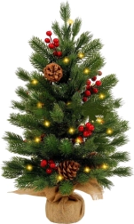 Το συμπαγές τεχνητό χριστουγεννιάτικο δεντράκι ύψους περίπου 60 cm φωτίζει όμορφα κάθε εσωτερικό χώρο. Διαθέτει ζεστό LED φωτισμό με 3 λειτουργίες, ρεαλιστικό φύλλωμα βελόνας, διακόσμηση με κόκκινες ρόγες και φυσικά κουκουνάρια και σταθερή βάση ντυμένη με λινάτσα. Περιλαμβάνονται μπαταρίες 3× AG13 για άμεση χρήση.