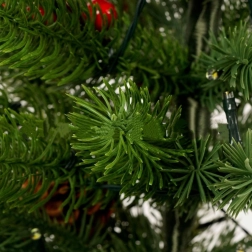 Τα ενσωματωμένα LED φωτάκια με 3 λειτουργίες προσφέρουν απαλό, ζεστό φως. Η εύκαμπτη κατασκευή των κλαδιών επιτρέπει εύκολο σχηματισμό, ενώ η διακόσμηση με κόκκινες ρόγες και κουκουνάρια χαρίζει φυσική και κλασική όψη. Η βαριά βάση με επένδυση λινάτσας κρατά το δέντρο σταθερό και ενισχύει το ρουστίκ στυλ.