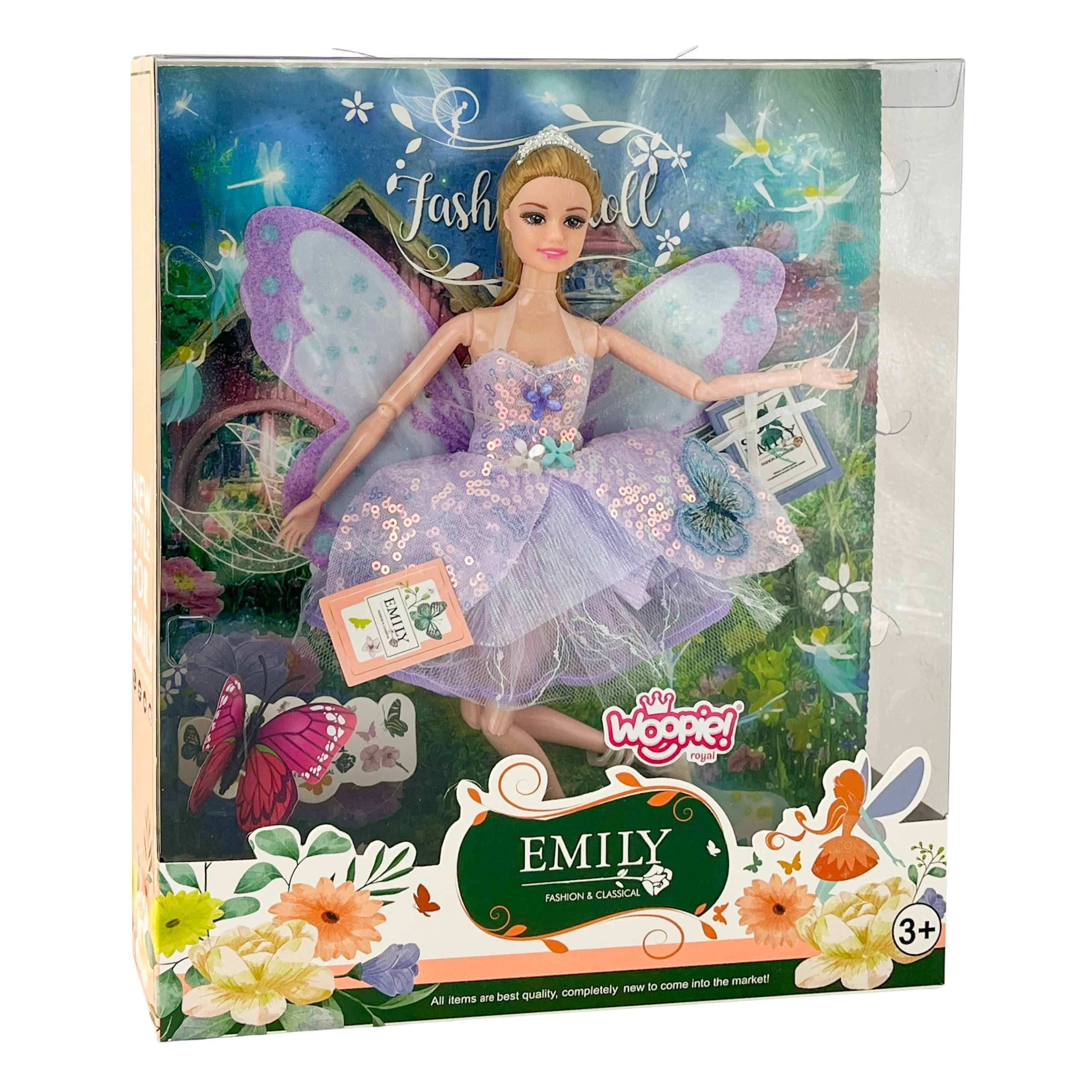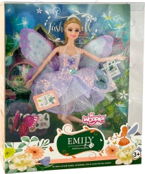 Ανακαλύψτε έναν κόσμο φαντασίας με τη νεράιδα Έμι, που μαγεύει με τα λαμπερά φτερά πεταλούδας, το λιλά παστέλ φόρεμα και τα κινούμενα άκρα. Κομψό τιάρα, στιλάτα παπουτσάκια και ποιοτική κατασκευή από ασφαλή υλικά μετατρέπουν κάθε παιχνίδι σε ένα μαγικό παραμύθι – υπέροχη ιδέα για δώρο.