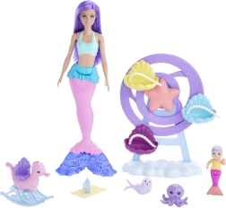 Ανακαλύψτε τον μαγικό υποθαλάσσιο κόσμο με το σετ παιχνιδιού Barbie γοργόνα με μωράκι. Η κύρια κούκλα με λεβαντί μαλλιά και ροζ-γαλάζια ουρά φροντίζει το χαριτωμένο θαλάσσιο μωράκι και τους θαλάσσιους φίλους. Περιλαμβάνει περιστρεφόμενο καρουζέλ-κούνια, κουνιστό ιππόκαμπο, μπιμπερό και μαλακή κουβερτούλα για ατελείωτες ιστορίες γεμάτες φαντασία.