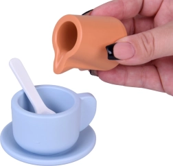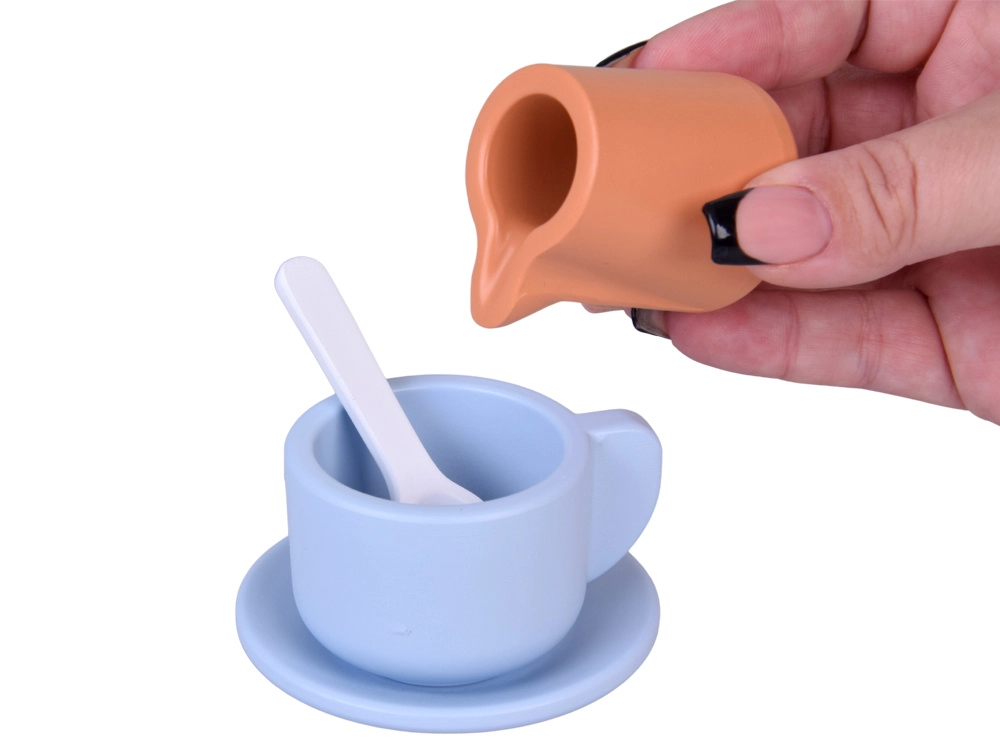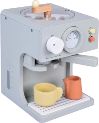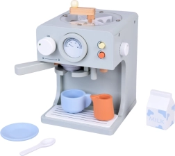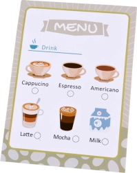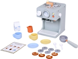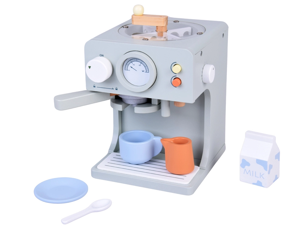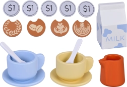 Περιλαμβάνεται πλήρες σετ αξεσουάρ: φλιτζάνια με πιατάκια και κουταλάκια, γαλατιέρα, κουτί «γάλακτος», ξύλινα κέρματα και μάρκες latte art για δημιουργικό στόλισμα. Τα παιδιά μπορούν, σύμφωνα με το μενού, να ετοιμάσουν espresso, cappuccino, latte ή americano και να σερβίρουν την οικογένεια και τους φίλους – όπως σε ένα αληθινό καφέ.