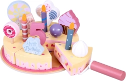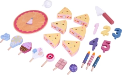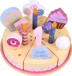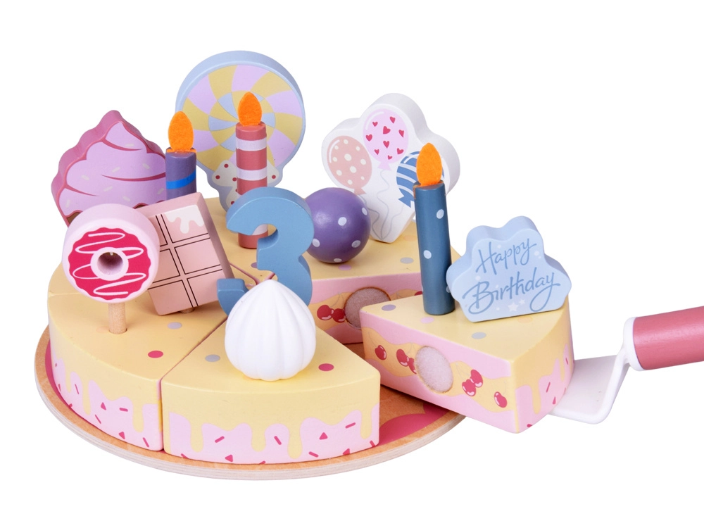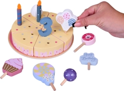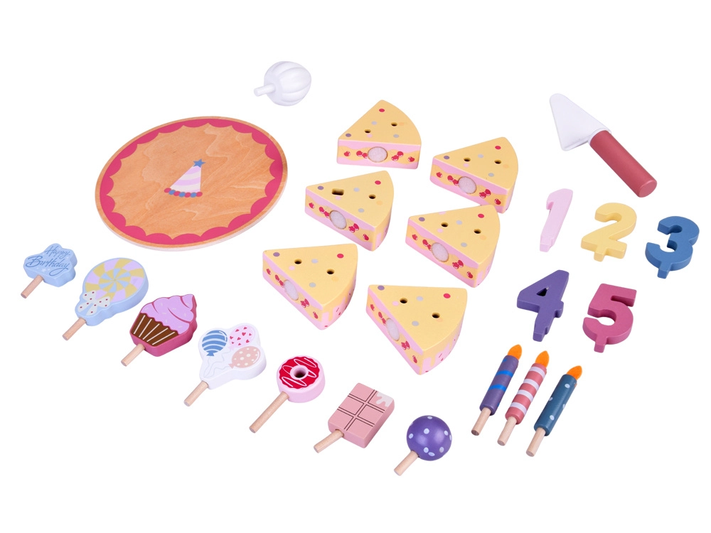 Φτιάξτε το δικό σας πάρτι γενεθλίων! Η ξύλινη τούρτα αποτελείται από 6 κομμάτια που μπορούν να “κοπούν” και να ξαναενωθούν, και να διακοσμηθούν με ανταλλάξιμα κεράκια, αριθμούς και γλυκίσματα. Το σετ είναι ιδανικό για ομαδικό παιχνίδι, εκμάθηση χρωμάτων, μέτρημα και εξάσκηση ευγενικού σερβιρίσματος.