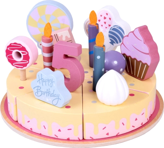 Λαχταριστή ξύλινη τούρτα γενεθλίων για κόψιμο που μετατρέπει κάθε παιχνίδι σε γιορτή. Τα παιδιά θα απολαύσουν το δημιουργικό διακόσμημα, το κόψιμο σε κομμάτια και το σερβίρισμα. Λείο, καλοτριμμένο ξύλο, μη τοξικές βαφές και πολύχρωμα αξεσουάρ (κεράκια, αριθμοί 1–5, γλυκίσματα, πινακίδα Happy Birthday) που υποστηρίζουν τη λεπτή κινητικότητα, τη φαντασία και το παιχνίδι ρόλων.