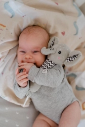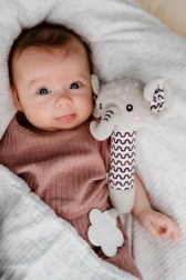 Ο λούτρινος ελέφαντας με σφυρίχτρα και μασητικό είναι το ιδανικό πρώτο παιχνίδι για νεογέννητα. Χάρη στο εργονομικό, επιμήκες σχήμα κρατιέται εύκολα ακόμη και από πολύ μικρά χεράκια, ενώ το απαλό σφύριγμα διεγείρει την ακοή και τραβά την προσοχή του μωρού. Το απαλό, ασφαλές υλικό προσφέρει ευχάριστη αίσθηση και καταπραΰνει κατά την αγκαλιά.