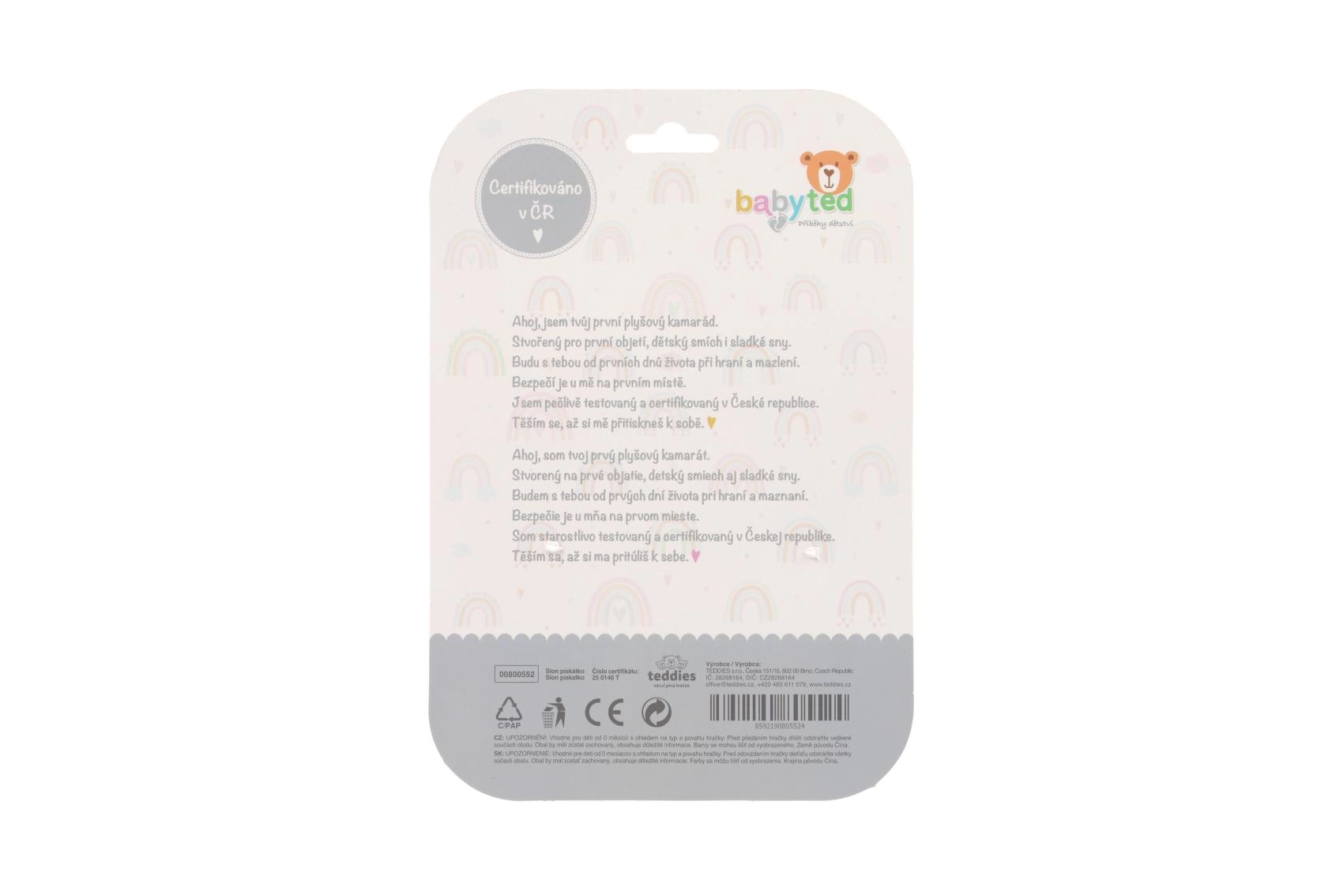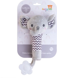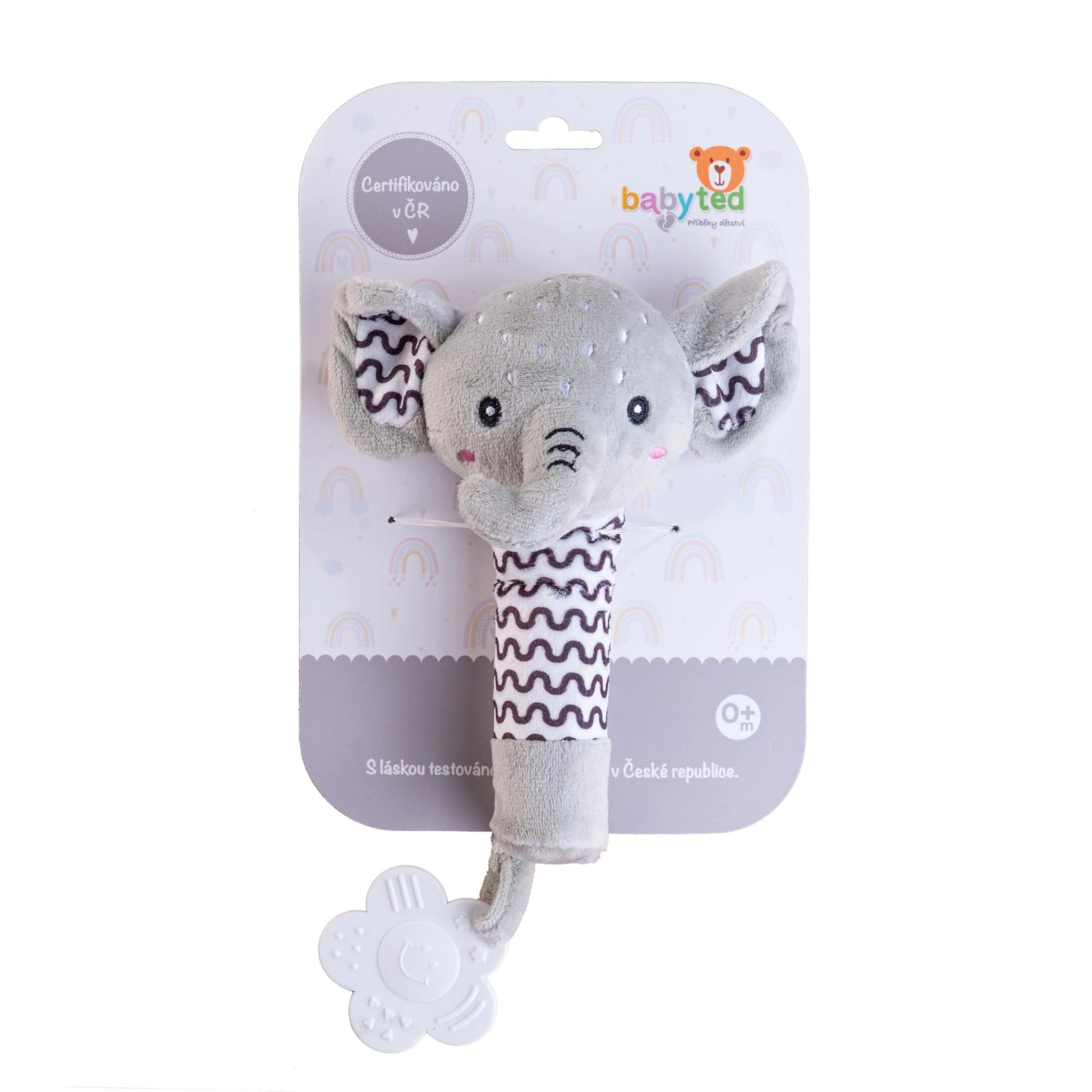 Το χαριτωμένο λούτρινο σφυρίχτρα και μασητικό σε σχήμα ελέφαντα από τη μάρκα BABYTED θα χαροποιήσει τα μωρά από τη γέννηση. Διαθέτει μαλακό σώμα για εύκολο κράτημα, που σφυρίζει απαλά όταν πιέζεται και στο άκρο της λαβής έχει μαλακό μασητικό σε σχήμα λουλουδιού για ανακούφιση των ευαίσθητων ούλων. Τα έντονα, αντιθετικά μοτίβα υποστηρίζουν την οπτική αντίληψη και το ασφαλές, απαλό λούτρινο είναι φιλικό για τα πολύ μικρά παιδιά. Πιστοποιημένο στην Τσεχία σύμφωνα με αυστηρά πρότυπα ασφαλείας.