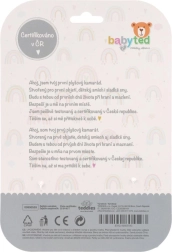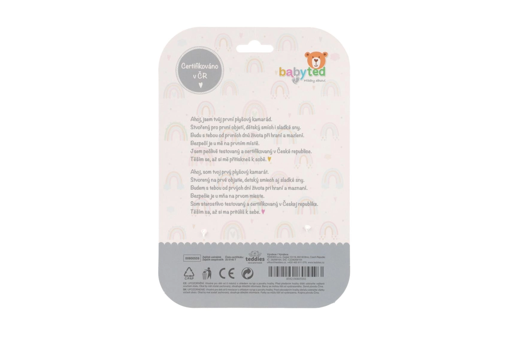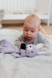Στο εσωτερικό κρύβεται απαλή κουδουνίστρα για ανάπτυξη της ακοής, σε μία γωνία μαλακό σιλικονούχο μασητικό για ανακούφιση στα ευαίσθητα ούλα και στις γωνίες κομπόι που υποστηρίζουν τη λεπτή κινητικότητα. Το πρακτικό μέγεθος 25 × 25 εκ. είναι ιδανικό για κούνια, καρότσι και καθισματάκι αυτοκινήτου.